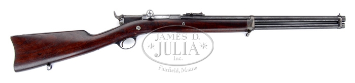 EXTREMELY RARE REMINGTON KEENE BOLT ACTION CARBINE SN NSN. Cal. 433 Spanish. Very rare carbine in an extremely rare caliber with only about four known and according to consignor none have nearly the condition of this one. Consignor states that this carbine is one of an order of twenty by a San Francisco express company. Consignor states that shipping order is stamped “Order not completed at this time”. This carbine has a 20” rnd bbl, full magazine with two bands with a tiny Lyman front sight dovetailed into top of front band. Forearm band has a sling loop with corresponding loop in buttstock. Rear sight is Remington’s tiny ladder rear sight graduated to 1,000 yards. Receiver has a magazine cutoff on left side and has the caliber marking vertically at left rear edge of receiver. Top of bolt sleeve has the usual Remington company & patent markings. Mounted in a nicely figured, uncheckered 1-pc half stock with straight grip & carbine buttplate. Bolt & carrier are bright. Accompanied by two tags that were attached to trigger guard that give a brief history of how the consignor found this carbine at a small gun show in Nevada. He states that when he found it, it was frozen in an old military leather scabbard and it took substantial work to free it before he was able to buy it. He verbally related that he has owned it for many years. CONDITION: Very fine. Bbl & magazine tube retain 75-80% dull orig blue, strong & bright in very sheltered areas. Magazine tube has fine pitting down most of bottom area consistent with long term storage in leather. Receiver retains 93-95% strong orig blue starting to turn a little purple at back end. Trigger guard retains about 60% strong orig blue with the same sort of fine pitting on bow as is on magazine tube. Buttplate retains blue on tang with balance a gray patina. Bolt & carrier are bright. Mechanics are crisp, bright shiny bore with a few spots of scattered pitting. 4-32682 JR606 (5,000-8,000)