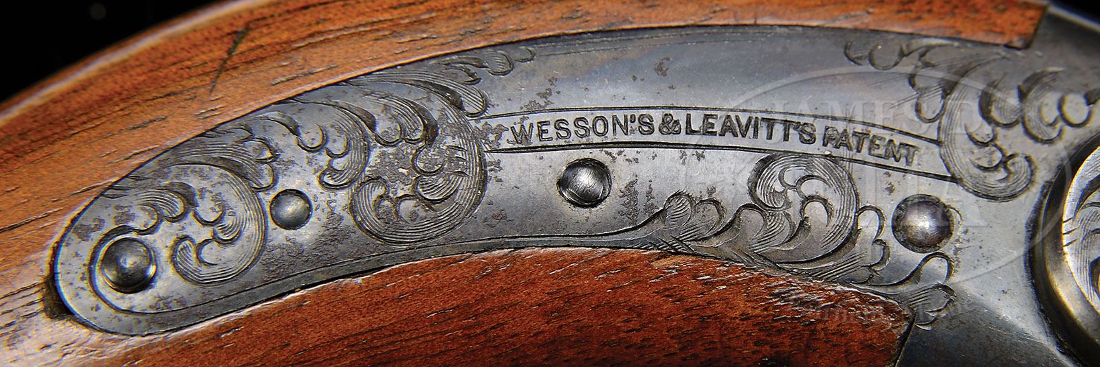 CASED WESSON & LEAVITT MASS ARMS PERCUSSION BELT REVOLVER. SN NSN. Cal. 31. Only about 1,000 of these revolvers were made in period 1850-51. Beautiful revolver with 6” rnd bbl, open bottom receiver, 6-shot cyl with etched decoration and very nicely engraved frame, lockplate & hammer. It has smooth 1-pc walnut grip with flared butt and brass backstrap. Accompanied by its orig blue velvet lined, mahogany case compartmented in bottom for revolver, a fine Mass Arms eagle flask, brass 2-cavity bullet mold without sprue cutter, “MASS ARMS CO” marked on bottom. It also has its brass bullet starter/rammer and an L-shaped nipple wrench. Another compartment has the orig key and pack of caps. This is a beautiful gun, possibly unfired, retaining most of its orig finish with accessories in matching excellent condition. CONDITION: Bbl retains strong traces of orig blue with balance flaked to brown/silver. Frame, lockplate, hammer & triggerguard retain about 50% muted case colors. Cyl has about 50% bright blue finish to highlights with silver/brown stippled backgrounds with rust and pitting. Grip is sound and retains virtually all of its orig varnish. Pistol mechanically functions well with bright shiny bore. Case is sound with a couple of cracks in lid, with nicks & light scratches. Interior is still bright with soiling in bottom from the revolver. Flask is virtually new. Mold, which is “MASS ARMS” marked, is in unused condition with areas of staining. Brass mushroom-shaped loading tool, L-shaped screw driver and nipple wrench are very good overall. 4-48813 JS59 (8,000-12,000)