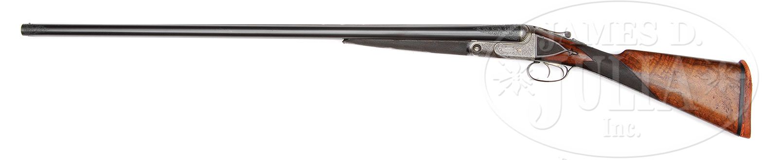 *EXCEPTIONAL PARKER BROS AAHE PIGEON GUN. SN 129747. (ca 1904) Cal. 12 ga. No. 2 frame. 32″ Whitworth steel bbls are engraved “Pigeon Gun Parker Bros. Makers. Meriden. Conn. Whitworth Steel.” on concave game rib. Bbl flats are marked with “W” “7” and weight of 4 lbs 8 oz. There are 3″ triangles of engraving at breech ends, and 2″ triangles at muzzles. Case hardened action is marked with patents, “7”, SN, and “A” on engine turned water table. Action features non-automatic safety, double triggers, and fences filed with three beads. Engraving is of classic, typical early AA style, open, shaded scroll with stippled background, and highlights of a variety of flowers. This engraving extends to trigger guard which has a “W” engraved on bow, and SN in relief at grip. Nicely fiddle figured European walnut straight grip buttstock measures 13-1/4″ over leather faced Silver pad, and features classic point pattern checkering with mullered borders at grip, (pattern unusual, most likely specially ordered, as most guns of this grade had fancy border checkering.) and inset checkered side panels with fleur-di-lis drop points. It is interesting to note that there are no gold mountings. Splinter ejector forend has nearly full coverage of checkering. Interior of iron is engine turned. Bore diameter: left-.737, right -.739. Bore restrictions: left -.038 (Full), right -.023 (Mod). Wall thickness: left -.025, right -.023. Drop at heel: 2-7/16″, drop at comb: 1-7/16″. Weight: 7 lbs. 6 oz. LOP: 13-1/4″. PROVENANCE: Factory letter outlining that his gun has six entries in the order book along with the stock book. The gun was ordered by O. R. Dickey (noted Boston trap shooter). Next repair orders were by C G Weld (another Boston trap shooter to whom Mr. Dickey obviously sold this gun, which also explains the “W” on trigger guard). Stock book lists this gun as having a 14-1/2″ LOP. Along with copies of 1904 and 1905 “Sporting Life” pages where Mr. Dickey and Mr. Weld are mentioned. CONDITION: Very fine, as found. Bbls retain nearly all of an old, nicely polished, re-black over a couple of spots of light pitting, with some dents on top of left bbl and side of rib about 12″ from breech end. Engraving and markings are all sharp and clear. Action retains a considerable amount of orig case hardening color in protected areas. (Percentage is difficult to calculate because of engraving and the fact that it doesn’t appear to have been very vivid initially.) Overall color is a pleasing brownish pewter gray. Stocks retain most of their orig varnish finish, worn through on high edges. Wood is considerably oil darkened. Checkering is slightly worn. What is an early replacement pad, fit to curve, is squashed flat at heel, petrified, and cracked at toe. Bores are excellent. Action is tight. Ejectors won’t trip, most likely due to the fact that this gun has been in storage for a very long time, and ejector sears are fouled with congealed oil. An unexplained hole is drilled through forend tip. This is the highest grade Parker produced at the time of its manufacture. Only early production guns are marked “Pigeon Gun”, one of a total documented production of 243 AA grade guns, 44 with 32″ bbls. 4-48116 MGM139 (20,000-30,000)