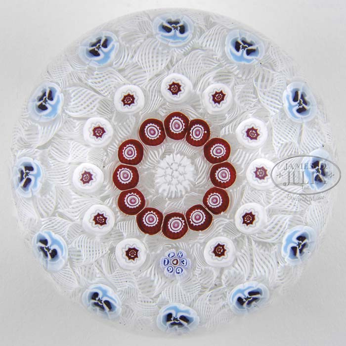 PARABELLE MILLEFIORI PAPERWEIGHT. Open concentric millefiori paperweight with a row of blue and white pansy canes on an upset muslin ground. Signed with a “PB 1993” signature/date cane. Also marked on underside “A/P 1-1”. SIZE: 2-3/4″ dia x 2-1/8″ t. PROVENANCE: Barry Schultheiss Collection. CONDITION: Very good to excellent. 5-63370 (400-600)