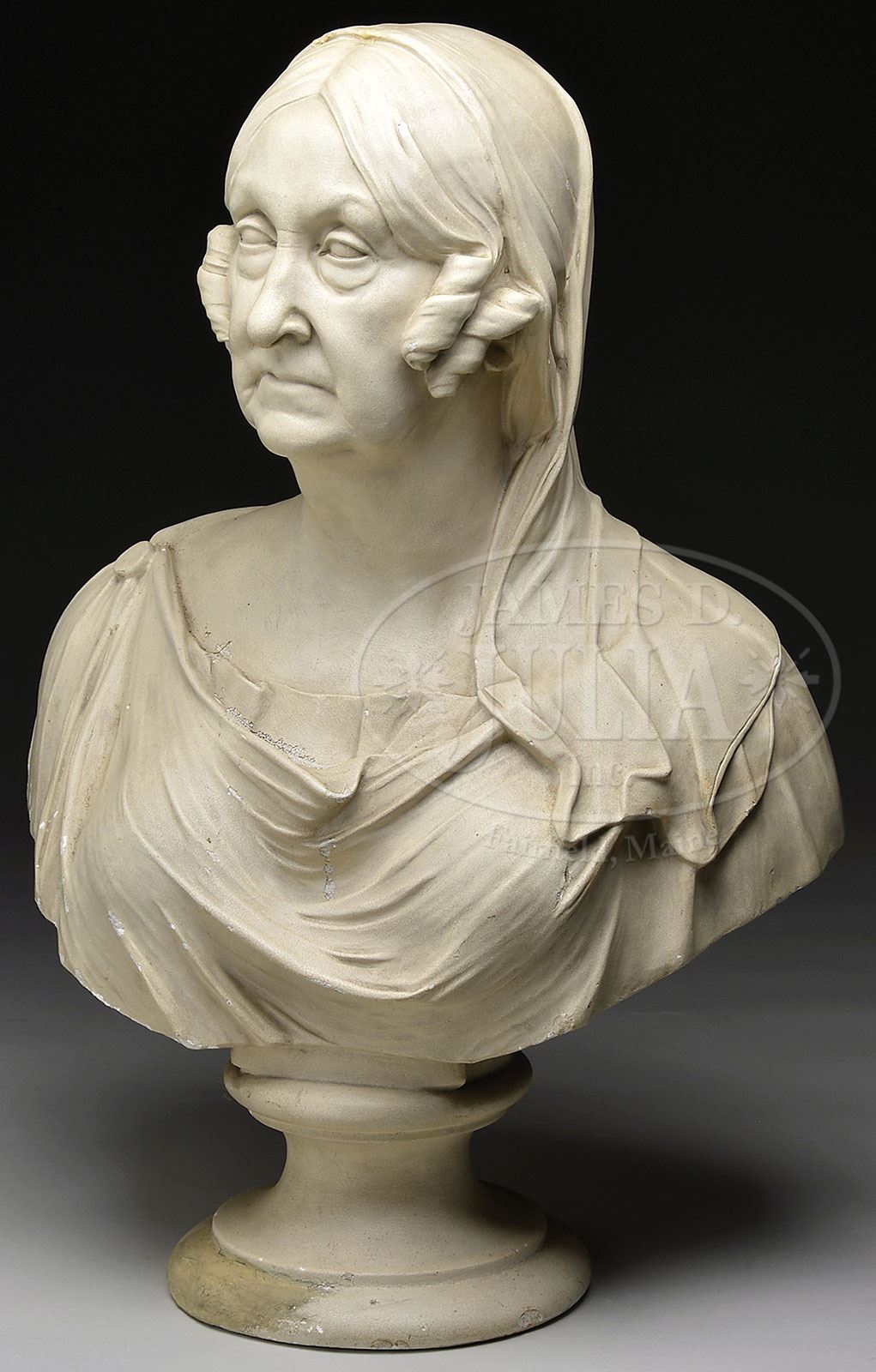PLASTER BUST OF MARY TODD LINCOLN. The well executed bust showing her with ringlet curls and head scarf. Unsigned, 19th/20th century. The bust with an integral turned base. Light aged off-white finish having light craquelure. Purportedly this was the plaster used for the modeling of Mary Todd Lincoln in bronze. SIZE: 27″ h x 20″ w. PROVENANCE: Collection and shop contents of Linda and the late Vito Peri (owners of the Blue Dolphin Antique Shop, Northport, Maine). CONDITION: 8″ old tight crack to back, some chipping to finish and edge. Generally good. 9-90072 (1,000-2,000)