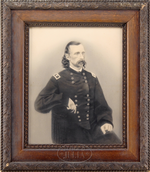 LARGE PHOTOGRAPHIC PORTRAIT OF GEORGE ARMSTRONG CUSTER. Maj. Gen. George Armstrong Custer posed without a hat in a velvet photographer’s chair. This late 19th C. image was originally done by John Goldin & Company in May of 1865. The photographic image enlarged & printed on paper was probably posthumously prepared sometime after his death. Framed in an antique oak & gessoed frame. CONDITION: Frame with slight imperfections. Image slightly faded, otherwise generally very good. 4-31595 JJ263 (3,000-4,000)