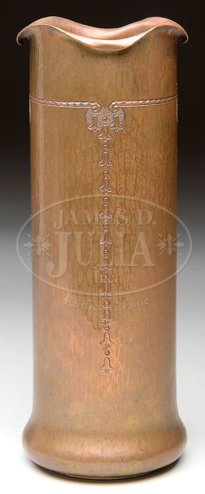 ROYCROFT BELLFLOWER VASE. Roycroft hand hammered copper vase has cylindrical body with ruffled and rolled lip. Vase is decorated with vertical bands of incised bellflowers. Signed with the orb mark. SIZE: 9-1/4″ t. CONDITION: Very good to excellent. 5-67196 (600-900)