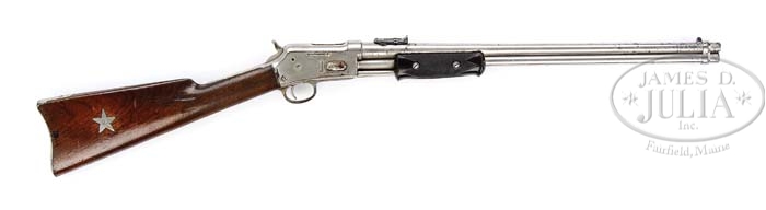 VERY RARE COLT MEDIUM FRAME LIGHTNING BABY CARBINE. SN 1571. Cal. 44 WCF (44-40). Nickel finish with 20-1/4″ bbl, full magazine, barleycorn front sight and reverse mounted 900 yard carbine ladder rear sight. Left side of receiver has a staple & ring and rampant Colt logo. Mounted with straight grain American walnut with checkered dbl fluted forearm and straight stock with carbine buttplate. Right side of stock is inlaid with a 1-1/4″ 5-pointed star. Manual safety is missing from trigger guard. Weight is 5 lbs. 3 oz., approx. one pound lighter than a standard carbine. Very few of the substantial number of medium frame Lightning rifles produced were made as Baby Carbines. Of those only a very few were in full nickel finish. Usually this style of finish was ordered by a Wild West performer, trick shot artist or as a presentation to someone of reasonable importance. PROVENANCE: Ted Knee Collection. CONDITION: Fine to very fine. Overall retains about 90% orig nickel with scattered spots of pimpling and pitting. Left side of receiver shows saddle ring wear. Wood is sound with a dark stained forearm and a large old rub on buttstock and overall retains 75-80% orig finish. Hammer functions but not as it should and safety notch is non-existent and should be addressed before any attempt to fire this carbine. Strong bright bore with scattered light pitting. 4-36568 JR355 (3,000-5,000)