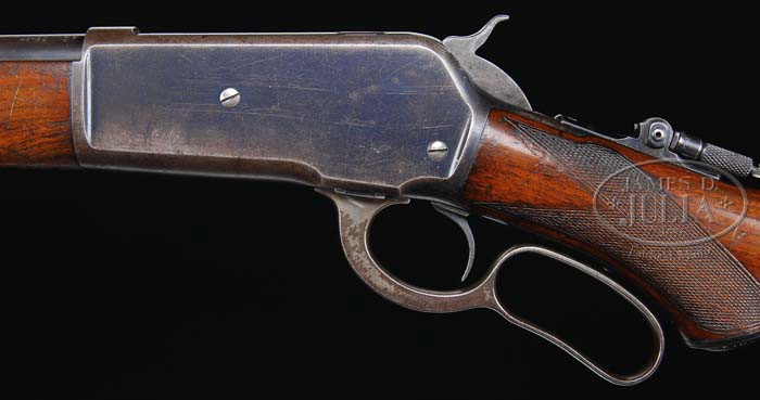 *RARE WINCHESTER MODEL 1886 DELUXE SHORT RIFLE. SN 148875. Cal. 45-90. 20″ rnd bbl, full magazine, combination front sight, sporting rear with set screw, coarse knurled post tang-mounted sight. Mounted with fancy “XXX” walnut, H-style checkered forend, H-style checkered pistol grip with Winchester hard rubber grip cap, Winchester hard rubber shotgun butt. Inspection of lower tang reveals assembly no. “16 XXX” & matching “16” can be found in top tang channel of stock. CONDITION: Fine. Bbl & magazine tube retain 85-90% orig blue with thinning in chamber area & a few spots of fine surface oxidation. Receiver retains 50-60% orig blue with wear on bottom, top & right side blending with silver & brown patina. Hammer shows faded orig case colors. Lever has silvered & mixed with brown patina. Stock is solid, with minor chip on upper right side, usual nicks & dings, slightly worn checkering & retains most of its piano varnish finish. Forend is sound with moderately worn checkering, usual nicks & scratches, hand-worn patina across belly with balance piano varnish finish. Mechanics are crisp; shiny bore with some minor scattered pits. 4-35852 BDT258 (13,000-17,000)