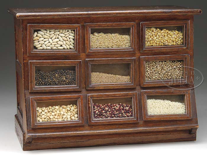 COUNTRY STORE SEED COUNTER SALESMAN SAMPLE. Absolutely fabulous salesman sample country store oak seed counter. Front has nine removable window displays that can be filled with your seeds of choice. Back of counter features nine drawers with oak drawer fronts and pulls with poplar secondary wood. Nice original finish with some very light alligatoring to the varnish. SIZE: 15-1/2″ w x 11-1/2″ h x 9″ d. CONDITION: In near excellent condition with nice original surfaces. One of the nicest country store salesman samples you will ever find. 1-10633 (2,000-3,000) Auction: Advertising, Toy & Doll - Spring 2011 Please Note: All prices include the hammer price plus the buyer’s premium, which is paid by the buyer as part of the purchase price. The prices noted here after the auction are considered unofficial and do not become official until after the 46th day. |