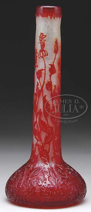 MICHEL CAMEO VASE. Vibrant red flowers in full foliage decorates this bulbous vase with long slender neck on a textured frosted ground with the top rim having same red coloration. Signed on the side in acid etched script “Michel” to side of foot. SIZE: 13″ t. CONDITION: Very good to excellent. 5-64432 (3,000-5,000)