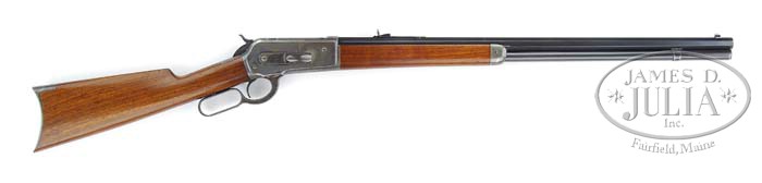 *WINCHESTER 1886 STANDARD GRADE LEVER ACTION RIFLE. SN 122103. Cal. 38-56 WCF. 26″ oct bbl, full magazine, half-nickel front sight with set screw, serrated side V-notch sporting rear with set screw, standard 86 receiver. Mounted with streaky straight grain walnut, uncheckered forend with nosecap, uncheckered straight grip stock with steel crescent buttplate. Accompanying gun is Cody Firearms Museum Winchester letter identifying gun as 38-56 oct bbl rifle, plain trigger; received in warehouse June 14, 1900; shipped from warehouse October 11, 1901, with one other firearm on order no. 115760. CONDITION: Very fine. Bbl retains 95% orig blue, minor muzzle wear, faint sharp edge wear, a couple of minor rub marks and the usual handling marks. Magazine tube retains 75-80% orig blue, a small cleaned area starting to silver and blending with brown patina. Receiver has 75-80% strong orig case colors, slightly darkening with a gray patina across bottom. Hammer has strong dark orig case colors. Lever has strong dark orig case colors on sides, blending with a dark gray patina across bottom. Stock is sound with some shallow minor nicks and dents, retaining most of its orig varnish blending with hand-worn patina in grip area. Buttplate shows fading case colors blending with a gray patina. Forend is sound with some minor nicks and scrapes and retains orig varnish finish, blending with some hand-worn patina. Mechanics are crisp, good bore with some minor scattered pitting. 4-37436 BDT89 (9,000-12,000)