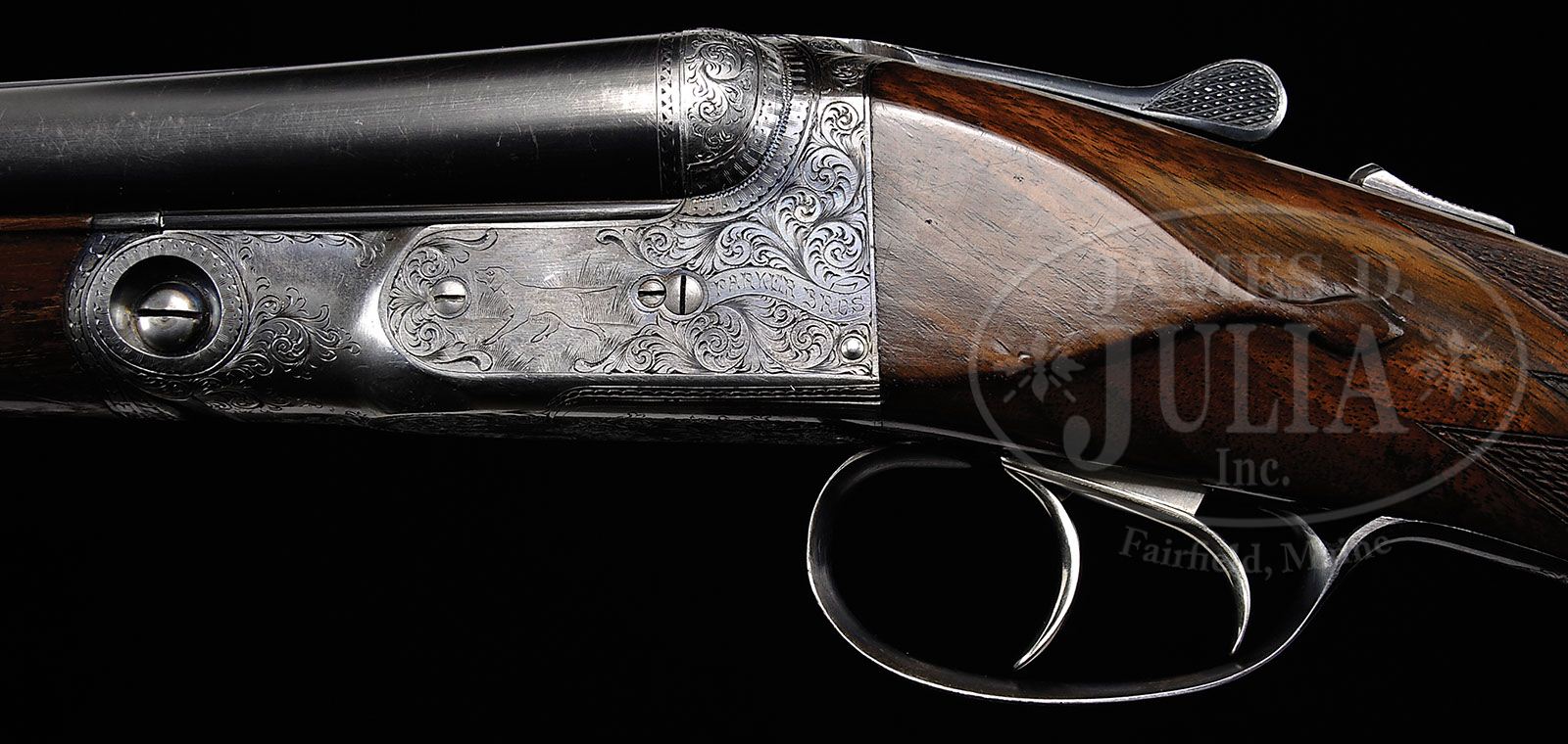 *20 GAUGE PARKER DHE WITH STRAIGHT GRIP. SN 235842. Cal. 20 ga. 2-1/2″ Chambers. 0 Frame. 28″ Titanic steel bbls with all correct markings. Typical case hardened action engraved with dogs on either side and nye of pheasants on bottom, features automatic safety and nickel-plated double triggers. Nicely flame figured American walnut straight grip buttstock measures 14-1/2″ over skeleton steel butt with typical point pattern checkering and “D” style drop points. A silver oval on toe line is engraved with initials “I. W. D.” Matching splinter ejector forend has typical latch and tip. Most specifications match those in PARKER IDENTIFICATION AND SERIALIZATION ledger, except ledger lists this gun with a semi-pistol grip. (There is no indication from examining this gun that it ever had anything but a straight grip.) Bore diameter: left-.615, right -.615. Bore restrictions: left -.020 (Full), right -.015 (Mod). Wall thickness: left -.025, right -.024. Drop at heel: 2-11/16″, drop at comb: 1-5/8″. Weight: 6 lbs. 10 oz. LOP: 14-1/2″. CONDITION: Very fine. Bbls retain approx 80% orig blue with numerous marks, thinned and silvered at muzzles and normal carry point, and at fences. Action retains 50 – 60% orig case hardening color, strong where protected, bottom and high points considerably silvered. Trigger guard retains most of its orig blue. Triggers retain nearly all of their nickel-plate. Stocks retain 80 – 90% of their orig varnish finish, worn through on sharp edges of side panels, somewhat at right side of butt, on rear of forend, with numerous light marks scattered overall. Bores are excellent. Action is tight. Ejectors are in time. This is a nice handling gun. 4-47581 MGM83 (13,000-16,000)