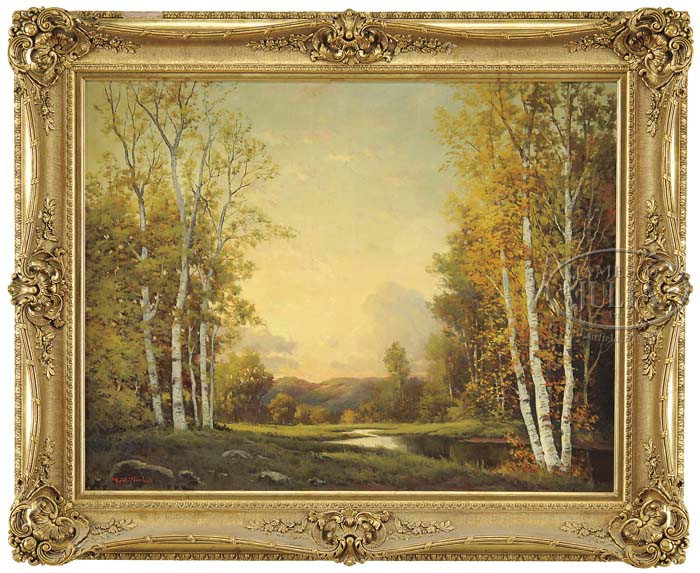 ROBERT WILLIAM WOOD (American, 1889-1979) “SUNSET”. Large oil on canvas landscape scene shows a colorful sunset between two stands of white birch trees with grass lined stream and hills beyond. Wonderful sky shading from light blue to pink. Signed lower left. Housed in a magnificent gesso decorated gilt frame. Titled on reverse of stretcher. SIZE: 28″ x 36″. PROVENANCE: From a fine Texas Estate. CONDITION: Craquelure, otherwise very good. 9-22956 (4,000-8,000)