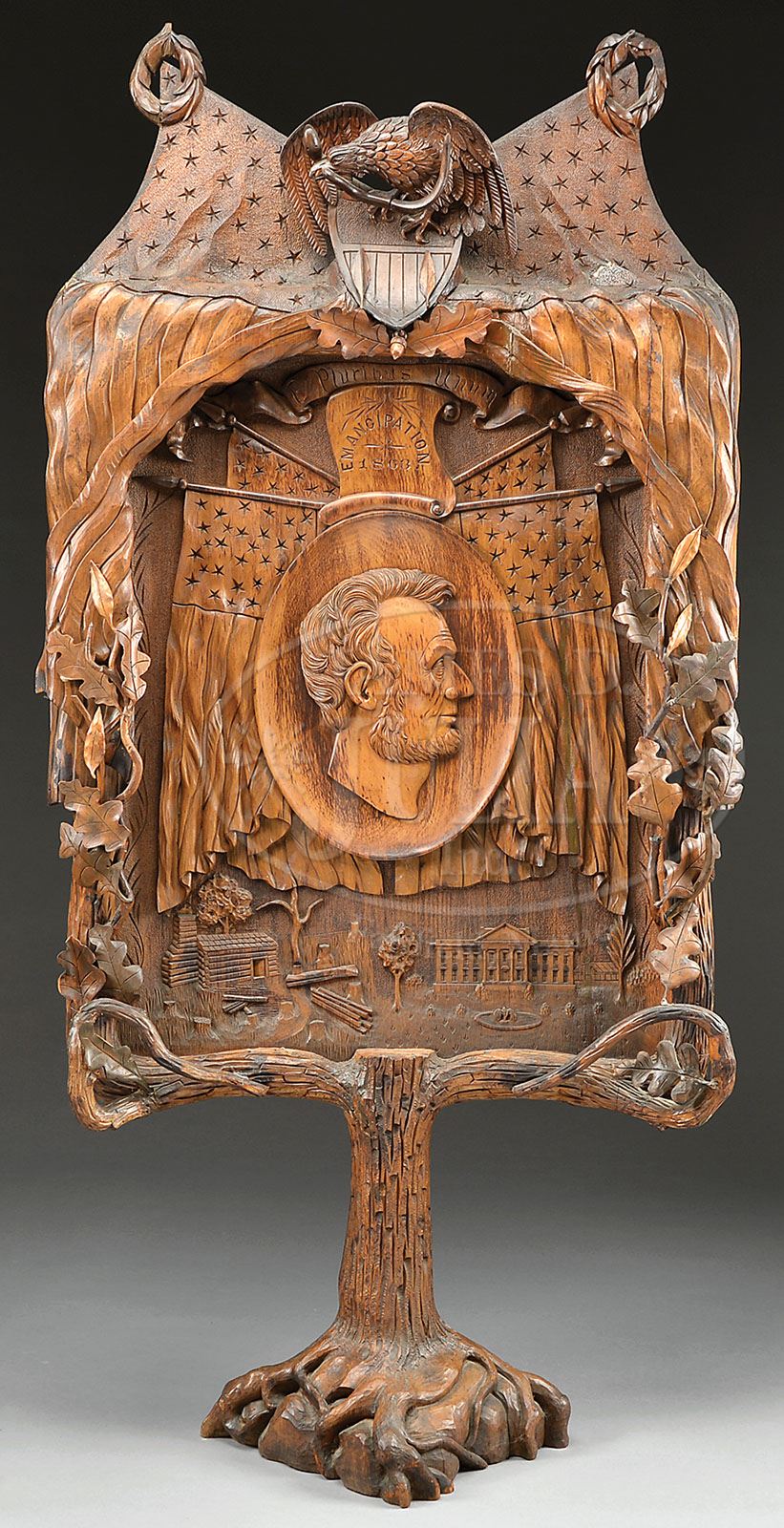IMPORTANT AND UNIQUE CARVED LINCOLN COMMEMORATIVE FLOOR SCREEN. Last third 19th century, America. The rectangular frame carved in relief with the bust of Abraham Lincoln in profile framed within four crossed American flags centering a scroll carved “EMANCIPATION 1863.” Beneath the bust is carved a log cabin on the left, the white house on the right. The plaque mounted within a frame comprised of oak leaves and branches issuing from a tree trunk stand, the base mimicking the roots of the tree. The top of the frame carved with draped American flags, each surmounted by a wreath, all centering a carving of the great seal of the United States. SIZE: 74″ h x 36″ w. CONDITION: Floor screen retains original surfaces, now somewhat crusty and dry. Stress cracks are present along the top of frame. Minor repairs to oak leaves, one leaf tip absent. Overall very good. 9-90493 (15,000-25,000)