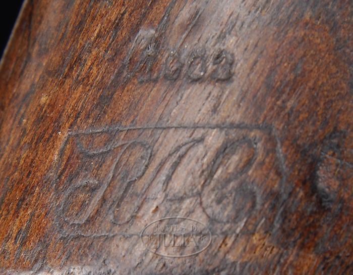 COLT ARTILLERY SINGLE ACTION ARMY REVOLVER. SN 5211. Cal. 45 Colt. Usual configuration with 5-1/2″ bbl, slightly thinned front sight with “COLT” re-rolled block letter address. It has 2-line patent date and “U.S.” on left side of frame. It has second style short checkered hammer spur with early style straight cone firing pin. Fitted with 1-pc walnut grip bearing Rinaldo A. Carr (“RAC”) cartouche under date “1903” on right grip and his “RAC” stamp on bottom of each side of grip. Frame is numbered “5211” which falls directly in series of revolvers issued to the 7th Cavalry prior to Little Big Horn. Trigger guard is numbered “8165” and buttstrap is numbered “73410”. Buttstrap was slightly thinned during refitting process to accommodate restamping the number. Bbl is numbered “8821” and has “PP” proof. Cylinder is numbered “137637” which indicates that it was reworked at Colt in 1896. It has third type ejector rod housing with bull’s eye ejector rod head. Accompanied by a 2-page Kopec letter detailing most of above information. Also accompanied by a Colt factory letter identifying this revolver as having been shipped June 16, 1903 to Springfield Armory in a shipment of 200 same type guns. Under remarks they state that the orig records for this revolver were lost or destroyed. CONDITION: Very good to fine. Bbl retains about 70% thin Colt blue, strong & bright in sheltered areas. Cylinder retains about 50% thin blue, strong over about 1/3 of surface. Frame retains a bluish dark case colored finish and hammer traces of faded case colors. Grip frame retains traces of blue in sheltered areas being mostly a mottled silver/brown patina with some small hammer or vice marks on trigger bow. Grip, with its clear cartouche & date, has a chipped right toe and shows moderate wear and retains a dark hand worn patina. Mechanics are crisp, bright shiny bore with a spot or two of light rust. A fine orig authentic artillery whose frame could have been with Custer. 4-31229 JR208 (7,000-12,000)