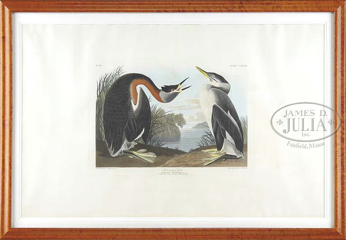 JOHN JAMES AUDUBON (American, 1785-1851) “RED-NECKED GREBE”. R. Havell Edition, 1836, No. 60, Plate CCXCVIII. Colored lithograph scene shows a male & female Grebe on the edge of water with blue & white cloud sky. Center bottom with title, bottom left “Drawn from Nature by J. J. Audubon, F.R.S. F.L.S.”. Lower right “Engraved, Printed & Coloured by R. Havell, 1836″. Housed in a reproduction birdseye maple frame with white matte and glass. SIZE: Paper: 26″ x 39-1/4”. PROVENANCE: From a Bar Harbor, Maine home. CONDITION: Examined out of frame. Some toning at margin edge, very good. Hinge mounted. 9-23358 (2,000-3,000)