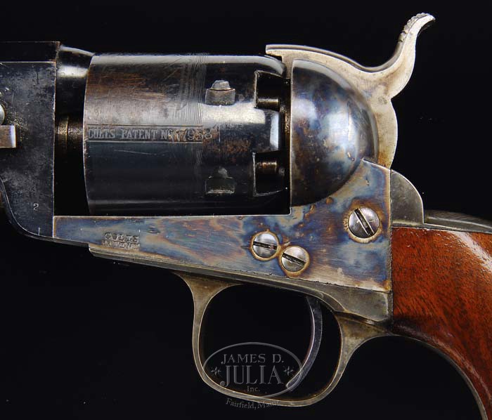 Correction: Serial Number should read “117964” not 117904″. This means the pair are within 8 serial numbers apart, not 54 serial numbers apart. EXCEEDINGLY RARE CASED PAIR OF PRESENTATION COLT MODEL 1851 NAVY REVOLVERS. SN 117904 & 117958. Cal. 36. Exceptional & exceedingly rare cased pair of Civil War presentation Colt Model 1851 percussion revolvers. This pair is identical in all respects with 7-1/2″ oct bbls, brass pin front sights, “NEW-YORK U.S. AMERICA” addresses and “COLT’S PATENT” on left side of frames. They have silver plated brass trigger guard & back straps with 1-pc walnut grips. Each back strap is identically engraved “PRESENTED TO CAP. A.L. HOUGH BY UNION RIFLES TERRE HAUTE, IND.”. Serial numbers on both revolvers, on frames, trigger guards & butt straps are accompanied by a small number “2”, undoubtedly indicating that they are a pair. Accompanied by their orig burgundy velvet lined mahogany Colt casing with mortised brass lock & diamond shaped escutcheon in front. Bottom is compartmented for the two revolvers, a sgl sided angle spout, “COLT’S PATENT” flask, a “COLT’S PATENT” 2-cavity iron bullet mold with sprue cutter, a laquered tin of 500 Eley’s caps, an L-shaped nipple wrench & a spare, orig, unnumbered cylinder. Right rear corner compartment contains bullets & balls. Also accompanying are four packets of orig combustible cartridges marked “FOR WHITNEY’S OR COLT’S NAVY PISTOL”. Capt. Alfred Lacy Hough was born in New Jersey & enlisted in the 17th Pennsylvania Infantry in April 1861 and mustered out in June 1861 to accept a commission as Captain in the 19th Infantry. It was apparently at this time that he was sent to Indiana as a recruiting officer and apparently became associated with the Union Rifles in Terre Haute. It is unclear exactly what the Union Rifles actually were but a later bit of information disclosed that the Union Rifles, in May of 1864. had opened a recruiting office and raised money & supplies to supply men in the field and relief to the families of the soldiers who were not present to provide for them. The Union Rifles apparently had been formed in April 1861 just for that purpose. There is no indication of the reason for the presentation although it can be assumed that the presentation in some way related to Capt. Hough’s recruiting efforts in the area. Capt. Hought served throughout the entire war and was breveted Major in Sept. 1863 for gallant & meritorious service in the Battle of Chickamauga. He was then promoted to Brevet Lt. Colonel in March 1865 for the mustering of troops and on the same day to Brevet Colonel for gallant & meritorious service during the war. He remained in the 19th Infantry until September 1866 when he was transferred to the 28th Infantry, then was reassigned to the 13th Infantry in 1870 & promoted to the prominent rank of Major in the 22nd Infantry in 1874. He was made permanent Lt. Col. in the 16th Infantry in Feb. 1882 and served on the frontier at Fort Davis, Arizona Territory as Post Commander from May to August 1882. He was promoted to Colonel of the 9th Infantry in 1888 and retired in April 1890, ending a long & distinguished military career served with courage & honor. Included in the lot is a copy of Hough’s book “Soldier in the West, C.W. Letters of Alfred Lacy Hough” a digest of the author’s patriotic feelings about the War, his personal life back on the home front, and his development as a professional soldier. Additional research in the Terre Haute, Indiana area newspaper morgues may disclose the reason for the presentation of this wonderful pair of revolvers to Capt. Hough. CONDITION: Extraordinarily fine, probably unfired. Both retain virtually all of their strong, bright orig factory finish with glossy Colt blue on bbl & cylinders with some light flaking on both bbls & cylinders. Frames, hammers, rammers & rammer handles all retain about 99%+ of their brilliant orig factory case colors. Trigger guards & back straps retain virtually all of their orig silver finish, slightly thinned on back straps in the engraved areas. Grips are pristine, retaining virtually all of their brilliant orig factory varnish. Both revolvers appear to be unfired with both cylinders retaining all six crisp safety pins. Case is completely sound with minor handling & storage marks & retains virtually all of its orig factory varnish. Interior is heavily faded in lid and moderately faded in bottom with wear & soil from the front sights & hammer spurs. Flask is fine, probably not orig to this set and retains 75-80% orig finish with several small dents on back side. Mold is crisp & new retaining about 98% orig finish. Spare cylinder is also new. Nipple wrench & cap tin are fine. Two of the cartridge packets are crisp & orig with the other two in slightly soiled condition with an open seam on bottom of each. An extraordinary set in as fine orig condition as one would ever fine anywhere else in the world. 4-35780 JR347 (180,000-225,000)