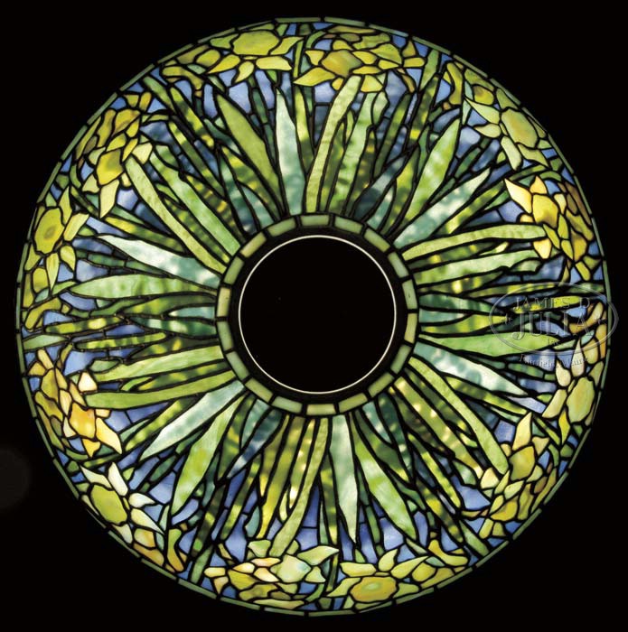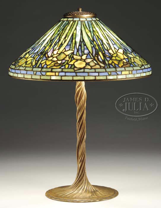 TIFFANY STUDIOS DAFFODIL TABLE LAMP. Conical shape shade begins with an outrageous blue background representing the sky. The long stemmed daffodils droop down from the geometric aperture. Their foliage covers most of the surface and the blossoms are in various stages of bloom appearing mainly above the three rows of the geometric border. The colors used in the stems are an ethereal green, mottled with other earthen hues. The flowers are constructed in a multitude of yellows, butterscotch and cream. The shade is supported by a bronze twisted vine base with four sockets, riser, wheel and pierced top cap. The entire lamp carries a gold finish. Shade is signed “Tiffany Studios New York 1497” and the base is signed “Tiffany Studios New York 443”. SIZE: Shade is 20″ dia. Lamp is 27″ t. CONDITION: Very good to excellent with very few, if any hairlines. Wear to gold commensurate with age. 5-62024 (40,000-50,000)