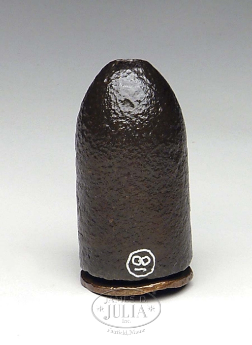 CS 2.25” TENNESSEE SABOT (MULLANE) SHELL. Excavated. Three iron pins on the base and the square nut intact. Fitted for wooden fuse. CONDITION: Light to medium ground action. 4-55918 JM110 (850-1,100)