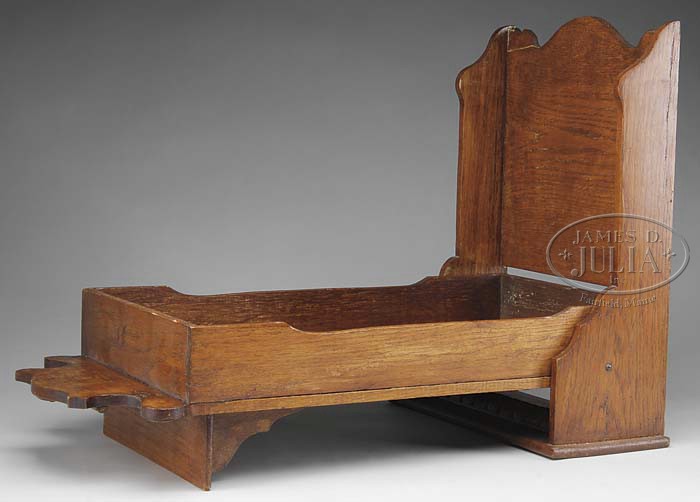 SALESMAN SAMPLE MURPHY BED. Delightful miniature bed to be built into a wall or as a stand-alone. Appears to be oak with shaped sides and carved bead molding and button accents. When closed “bottom” of bed reveals full length mirror. Upon opening, space for a mattress is revealed. A great space saving invention. SIZE: 14″ w x 25″ h x 6″ d. CONDITION: Appears to be refinished, some small cracks to wood. 1-10831 (500-700) Auction: Advertising, Toy & Doll - Spring 2011 Please Note: All prices include the hammer price plus the buyer’s premium, which is paid by the buyer as part of the purchase price. The prices noted here after the auction are considered unofficial and do not become official until after the 46th day. |