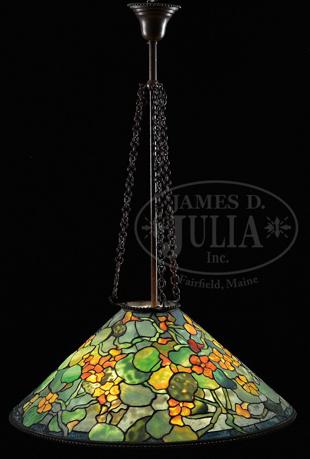 TIFFANY STUDIOS NASTURTIUM CHANDELIER. Tiffany Studios chandelier has large conical shade with nasturtium flowers, stems and leaves encircling the entire shade. The nasturtium flowers are done in greens, ambers, as well as yellow confetti glass, with large green leaves of nicely mottled and textured glass, all set against a bluish-gray background. The bottom edge of the shade is trimmed with heavily textured shaded blue panels and the shade is finished with a beaded trim. Complete with original hardware with a single suspension rod supporting a six-socket cluster with three chains attaching the shade to the Viking ball. Shade is signed “Tiffany Studios New York 610-6”. SIZE: Shade is 28-1/2″ dia and 46″ from ceiling to bottom of shade. CONDITION: Very good to excellent with only a few tight hairlines. 5-67830 (60,000-80,000)