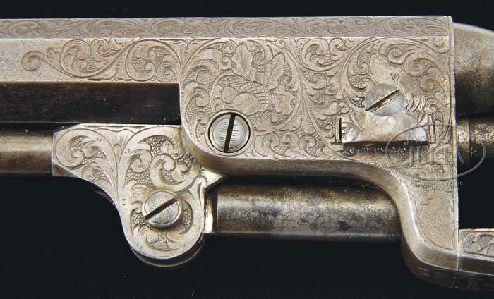 ENGRAVED COLT MODEL 1849 POCKET PERCUSSION REVOLVER. SN 138571. Cal. 31. Fine Gustave Young engraved ’49 pocket with desirable 6″ oct bbl, brass pin front sight and hand engraved “Saml Colt” address. Left side of frame has “COLTS PATENT” hand engraved in a kidney shaped panel. Small guard silver plated trigger guard and backstrap contain a 1-pc smooth ivory grip with last 3 digits of SN in backstrap channel. Revolver has Mr. Young’s deluxe engraving consisting of full coverage on the frame of foliate Arabesque patterns with several scrolls terminating in flower blossoms. Matching engraving extends over the bbl lug with 1 scroll terminating in a well detailed dog’s head and another with the unusual pattern of 2 acorns and 3 oak leaves. Another scroll on the right side terminates in a flower blossom. Engraving patterns extend over the top side flats with fine line geometric borders around the address and chip and dot borders around the muzzle and at the breech end. Rammer pivot is engraved to match. Hammer also received Mr. Young’s deluxe treatment of full coverage foliate Arabesque patterns on sides with a wolf’s head on each side of hammer nose. Sides of hammer spur and top edge of hammer have fishscale engraving with hand cut checkered spur. Top of backstrap has Mr. Young’s trademark fan pattern with sunburst patterns on each side of backstrap ears. Near the top of backstrap, at the heel on the backstrap and trigger guard are all engraved to match. All the screws are engraved on both ends. Cylinder is a scarce 6-shot style with stagecoach holdup scene roll marking. The bbl, rammer handle and wedge are all matching numbered, 138567, while the other numbers on all of the other parts are numbered 138571. Whether a mix-up in the factory or two identically engraved revolvers having their front ends switched will never be known, but it is apparent that these parts have been together for the life of the revolver. PROVENANCE: Col. Kenneth P. Brown Collection. CONDITION: Very good, front end mismatched as noted with the balance of revolver matching including cylinder and grip. Overall the steel parts retain a dark gray metal patina showing light to moderate wear. Cylinder shows heavier wear with possibly an old cleaning and retains 60-70% stagecoach holdup scene. Trigger guard and backstrap retain silver in sheltered areas, being mostly a medium mustard patina. Grip has chipped heels and sows moderate wear and retains a wonderful, mellow ivory patina. Mechanics are fine, worn dark bore. 4-39411 JR213 (4,000-6,000)