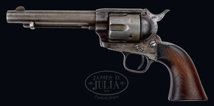 RARE ROUGH RIDER COLT ARTILLERY SINGLE ACTION ARMY REVOLVER. SN 10139. Cal. 45 Colt. Usual configuration with 5-1/2″ bbl, slightly altered front sight with earliest script-type address with serifs. Left side of bbl, unusually, is marked “45 COLT”. Left side of frame has 2-line patent dates and a small “U.S.”. Frame is numbered “10139”, trigger guard “336” with an Ainsworth “A” and backstrap “1994”. Bbl is numbered “9200” with two small dots in front of number. It has first style ejector rod housing with a later half moon ejector rod head. Cylinder has only a partial number “–78”. Fitted with 1-pc walnut grip without cartouche. Accompanied by a 2-page Kopec letter identifying & authenticating this revolver as above. Also accompanied by a letter from Springfield Research Service further identifying this revolver as having been issued to Trooper George Thompson of the 1st U.S. Volunteer Calvary Regiment (Rough Riders). Trooper Thompson enlisted on June 24, 1898 at Santa Fe, NM and was listed as a cook. He was originally assigned to another troop but transferred to Troop I on July 8. During transit, in preparation for action in Cuba, Trooper Thompson came down with dysentery and was left in the hospital at Jersey City, NJ on August 18. He was discharged on Sept. 29, 1898. Also accompanying are several pages of Thompson’s company muster roll. It is unclear at this time whether Trooper Thompson was allowed to keep his Colt or if it may have been reassigned within regiment and therefore saw action in Cuba. CONDITION: Good. No orig finish remains being mostly a mottled gray/brown patina with some traces of cold blue on bbl & frame with fine pitting around forcing cone area and on cylinder. Grip has a chipped left toe with some slight warping on right side, otherwise shows light to moderate wear with a dark hand worn patina. Mechanics are fine, strong bright bore with a few scattered spots of light pitting. A great rarity in an authentic, identified Rough Rider Colt. 4-32897 JR205 (25,000-35,000)