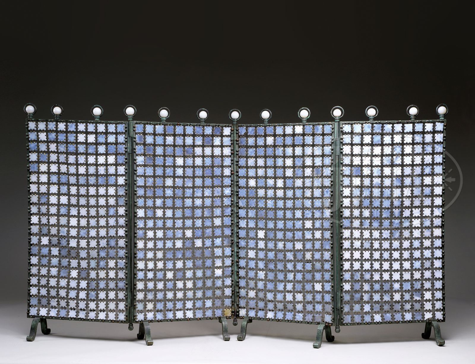 RARE TIFFANY STUDIOS CHAIN MAIL FIRE SCREEN. Important Tiffany Studios fire screen has four sections, each 16″ wide, with simple bronze frames and scrolled bronze feet supporting center curtains of Tiffany Chain Mail with glass tiles of white and bluish opalescent glass. The screen is topped with white lightly iridescent balls within a bronze ring. The bronze is finished in rich brown patina with strong green highlights. Signed “Tiffany Studios New York”. Similar examples are pictured in the book “Tiffany Lamps and Metalware” by Alastair Duncan, pg. 458, illustration 1823 and pg. 460, illustration 1828. SIZE: 64″ w x 36″ tall to top of glass ball decoration. CONDITION: Very good to excellent with one replaced tile at the bottom of the screen. There are five slightly damaged tiles, three with tight hairlines, and two missing small pieces at a corner. 5-67835 (150,000-250,000)