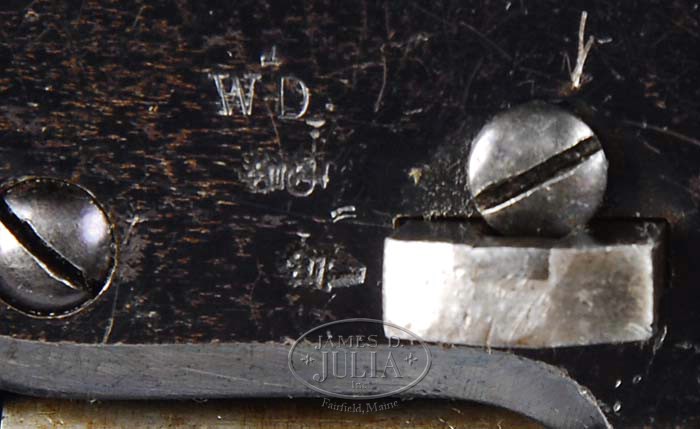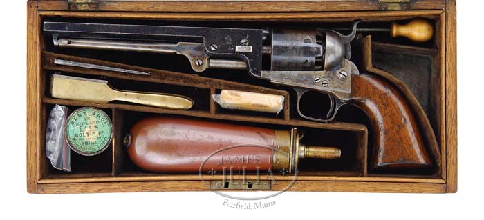 FINE CASED COLT MODEL 1851 LONDON NAVY PERCUSSION REVOLVER. SN 23508. Cal. 36. Blue & case colored with 7-1/2″ oct bbl, pin front sight and 1-line London address with spears at each end. Left side of bbl lug has usual British proofs above which is stamped “WD” and part of another stamp that may be part of the broad arrow. The “WD” stands for War Department. It has usual 6-shot cylinder with Naval battle scene and alternating British proofs on lands between nipple recesses. Left side of frame has “COLT’S PATENT” and it has large loop iron trigger guard & back strap with 1-pc walnut grip. Accompanied by an orig English oak casing with empty plate in top, lined with brown velvet and the Colt loading instructions inside lid. Bottom is compartmented for revolver, a brass 2-cavity “COLT’S PATENT” mold with sprue cutter, a James Dixon & Sons bag flask marked “COLT’S NAVY FLASK”, a tin of Eley’s caps, an L-shaped nipple wrench, an open packet of five combustible cartridges, contents are deteriorating. Right rear corner has a triangular shaped compartment with lid missing and in back has compartment for a cleaning rod with a replacement rod. CONDITION: Very fine, all matching including wedge. Bbl retains 80-85% glossy orig blue mixed with flaking & loss areas a medium patina. Rammer & handle retain most of their orig case colors, strong & bright on pivot, faded toward the ends. Frame retains most of its orig case colors, moderately faded on sides & recoil shields, brilliant in sheltered areas. Hammer retains 75-80% strong orig case colors. Cylinder retains 65-70% strong orig blue with one area flaked to a light patina and overall retains 97-98% strong Ormsby Naval battle scene. All six safety pins are present with three of them prominent. Trigger guard & back strap retain blue in sheltered areas with balance a gray/brown patina. Grip shows moderate wear with numerous nicks, dings & scratches and retains about 88-90% strong orig varnish. Mechanics are fine, very bright shiny bore. Case has a grain check in lid & another in bottom, otherwise is sound and retains most of an old restored finish. Interior is lightly to moderately faded with light soil showing wear from front sight & hammer spur. Flask retains about 80% strong orig finish. Mold is extremely fine. Altogether a very nice set. 4-35936 JR472 (10,000-15,000)