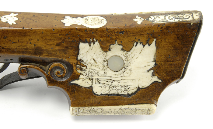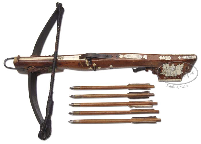 FRENCH CROSSBOW WITH FIVE BOLTS. SN NSN. 24″ Forged steel bow held in stock by linen thread, with greenish tassels, has old whipped linen bow string. 26″ Stock with horn buttplate has many decorated bone inlays, with one large stand-of-arms inlay at left side at cheek rest. Bolt bed is also of bone. Included are five 12″ tapered walnut fledged bolts with steel and brass heads. CONDITION: Fine. Metal parts are brown patina overall. Wood has old finish and shows some worm damage. Decoration on bone is getting thin, some pieces replaced. Newer bolts are fine. 4-42110 MGM290 (5,000-10,000)