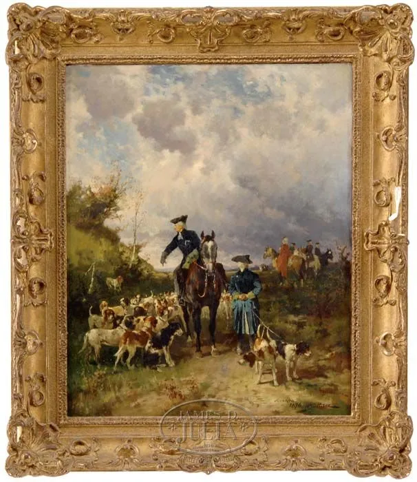 HANS BUTTNER (German 1850-1891) “GOING TO THE MEET”. Fine oil on canvas scene shows a man on horseback with a man beside holding two hunting dogs by leash while many dogs are surrounding the horse. Several riders on horseback are seen in background. All are under cloud and blue sky. Signed lower right “H. Buttner 1876 Munchen”. Housed in its original fancy frame with title and artist cartouche. SIZE: 19-1/4” x 15-1/2”. CONDITION: Very good. 9-74879 LG (6,500-8,500)