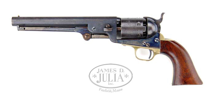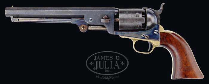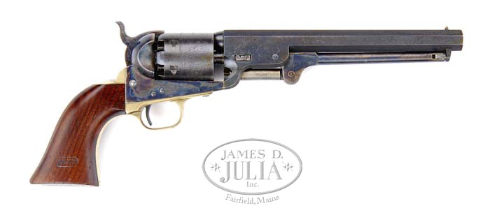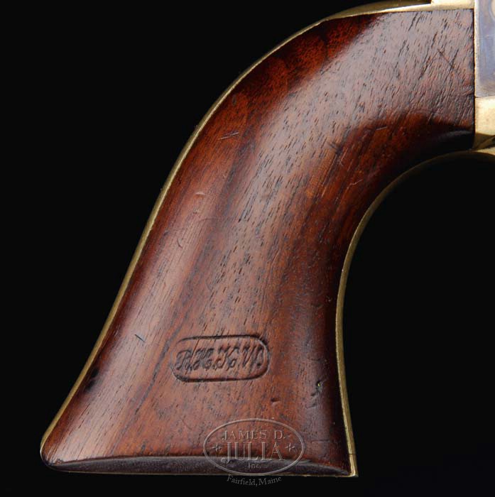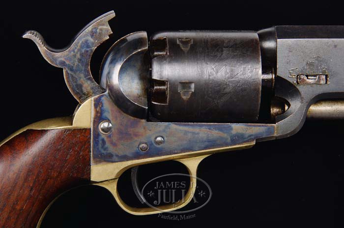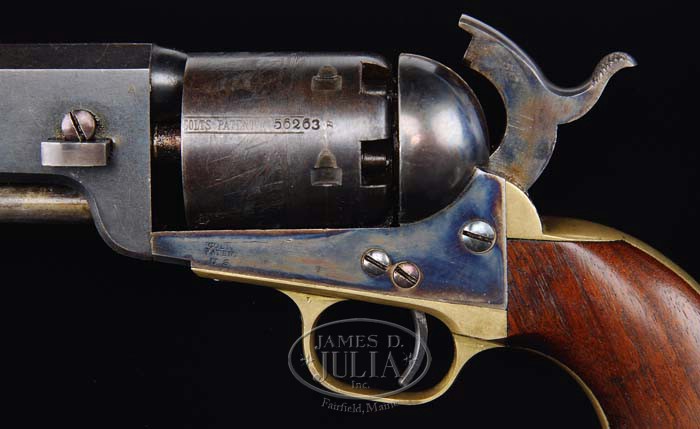 EXTRAORDINARY COLT LATE 3RD MODEL NAVY ARMY PERCUSSION REVOLVER. SN 56263. Cal. 36. Usual configuration with 7-1/2″ oct bbl, full brass pin front sight & 1-line New York City address with dashes. It has a tiny “U.S.” under “COLT’S PATENT” on left side of frame with never silver plated, brass trigger guard & back strap, containing a beautiful 1-pc walnut grip with crisp cartouches on each side. Left side has “JH” (James Harris) in a rectangle and right side has “RHKW” (Robert Henry Kirkwood Whitley) in a long oval. Top of back strap has a partial tiny “H” with a variety of other inspector initials on various parts. The 3rd model appears to have been the second highest production in the 1851 series but very few were legitimate Navy Armys, those Navy revolvers made for & issued to the Army instead of the Navy. CONDITION: Extraordinarily fine, all visible numbers are matching including wedge. Overall retains 99%+ strong orig factory finish including bright blue on bbl with only fine sharp edge wear & some slight spots of discoloration. Cylinder retains virtually all of its orig, slightly dulled blue factory finish with one mashed safety pin & the other five pins remaining crisp. Cylinder also retains virtually all of its Ormsby Naval battle scene. Frame & hammer retain all of their crisp brilliant factory orig case colors, slightly faded on left recoil shield. Trigger guard & back strap are crisp with a light mustard patina. Grips are equally crisp with two small dings on right side showing no wear and retaining all of its orig oil finish. Mechanics are crisp, bright shiny bore with some scattered fine pitting. A truly rare, exceptional & extraordinarily beautiful Colt Navy. 4-35779 JR373 (55,000-65,000)