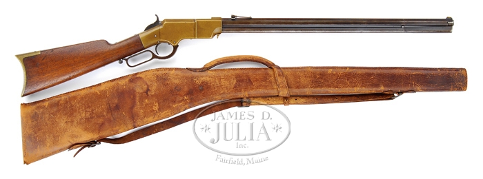 HENRY 1860 LEVER ACTION RIFLE SN 9578. Cal. 44 RF Henry. Later style rifle with standard 24 1/4″ octagon bbl with integral magazine tube. Brass front sight has been slightly modified with 900 yard Henry ladder rear sight. Left side of bbl and stock mounted with sling swivels. Mounted with straight grain uncheckered American walnut with crescent buttplate. Assembly numbers match on bbl and collar. Matching serial numbers appear on bbl, lower tang, toe of buttplate and in top tang channel of stock. Also includes an original but worn leather case marked William Read and Son, Boston. CONDITION: Very good. Bbl is a combination of pleasing brown/patina and silver with very visible blue in the gullets. Receiver is a wonderful dark mustard patina with sharp edges. Lever is mostly a chocolate brown patina with hammer showing brown patina with some silvering. Stock is of usual oil finish with a very pronounced “Henry bump”. Rear sling swivel has left a darkened ring around the base and just behind the sling swivel base and below the buttplate there is a deep gouge of wood missing. Buttplate is also of a dark mustard patina matching the receiver. Accompanied in the trap door is an original four piece iron and brass tip cleaning rod. The lower tang is stamped with an “H”. Mechanics are crisp. The bore is strong and dark showing some light pitting. The leather case is missing end cap and tie down strap is broken at the last notch. Also stitching is missing in various places. 4-33581 BT15 (25,000-35,000)