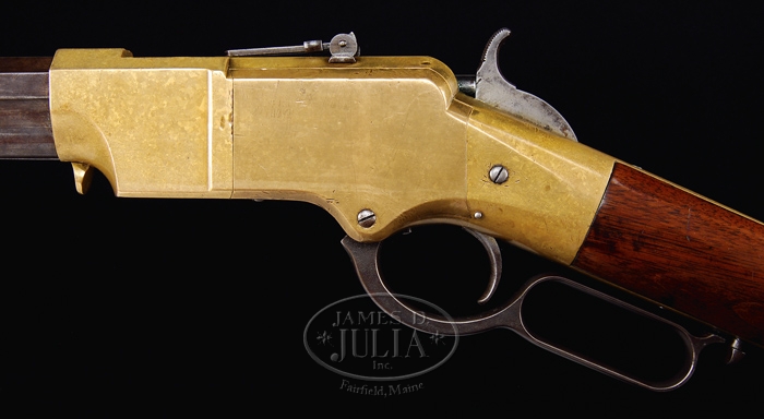 EARLY HENRY MODEL 1860 LEVER ACTION RIFLE. SN 491. Cal. 44RF Henry. Standard 24-1/4″ oct bbl with integral mag tube. German silver front sight with 1000 yd Henry ladder rear sight. Rear sight is mounted in dovetail of receiver with no bbl dovetail provided. Mounted with straight grain, uncheckered American walnut with straight grip and rounded point brass crescent buttplate. This early Henry has all the correct matching numbers. SN on the bbl, inside lower tang, buttplate and buttstock as well as all of the screws. Assembly number of bbl collar and bbl match. CONDITION: Fine. Bbl and mag tube have traces of blue in the protected area, but overall carry a very pleasing medium brown and silver mixed patina. Receiver has a lovely yellow mustard patina color with edges remaining quite sharp. Side plates carry the characteristic duller patina color found on early Henrys. Lever is of a very dark patina color. Hammer has silvery sides and a dark patina back. Stock is sound with a few normal characteristic nicks and dings and carries a lovely hand worn patina restored finish. Mechanics are crisp. Bore is dark with strong rifling and scattered pitting. Truly a nice early matching number Henry. 4-33616 BT66 (45,000-65,000)