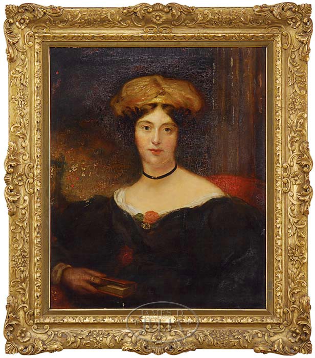 GEORGE HENRY HARLOW (British, 1787-1819) PORTRAIT OF ELIZABETH VENTRY. Oil on canvas half portrait shows young woman in regal costume including a black dress with white collar adorned with a red rose and diamond and citrine brooch. Her arm rests on a chair arm and she holds a red book with finger holding book open. She wears a diamond and gold ring and she has curly brown hair which shows under a hat adorned with a gold brooch. Housed in a magnificent antique carved wood gilt frame with gilt name plaque. The back stretcher has remnants of a typed label which partially reads “Married Nicholas De La Sherois Crommlin…Castle…Ireland…”. SIZE: 30″ x 25″. CONDITION: Some inpainting, fine craquelure, varnish consolidation, otherwise good. 9-94269 (10,000-15,000)