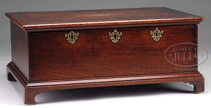 MID-ATLANTIC FEDERAL WALNUT BIBLE BOX. Circa 1820, probably Virginia. The dovetailed walnut box with hinged panel lid applied with molded edges, joined to the conforming dovetailed box mounted with three aligned locks and escutcheons on a molded base, raised on shaped bracket feet. The lid mounted with an oval silver name plate inscribed in script “From the / Marriner’s Society / to / Mr R. Morwan / 1820”. SIZE: 8-1/2″ h x 20″ l x 13-1/2″ d. CONDITION: Box retains old original surfaces and fittings such as hinges and lock. Feet original. The lid with old professional restoration in area of hinges and a restored split near front of top. Otherwise very good. 9-98632 (1,500-3,000)