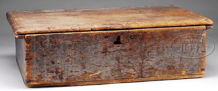 EARLY AMERICAN PINE BIBLE BOX IN BLUE PAINT. Late 18th century, Maine. The rectangular box with hinged conforming lid and rattail hinges; the ends with applied moldings. SIZE: 8-1/2″ h x 28″ l x 18-1/2″ CONDITION: The box retains original hinges, lock, hasp, and rose head nails. All surfaces original. Blue paint well-worn showing appropriate wear. 9-98691 (1,000-2,000)