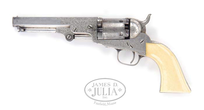 EXTREMELY RARE CASED ENGRAVED SILVER PLATED COLT MODEL 1849 PERCUSSION POCKET REVOLVER. SN 80221. Cal. 31. Silver finish with 5″ oct bbl brass pin front sight with engraved “Saml Colt” address. Has 5-shot cylinder with silver plated brass trigger guard & back strap and is fitted with 1-pc ivory grip. Frame, bbl, rammer pivot, hammer, back strap & trigger guard are beautifully engraved in Gustav Young’s deluxe coverage with spectacular intertwined foliate arabesque patterns and punch-dot background with some of the patterns terminating in flower blossoms. The left side of the bbl lug, left recoil shield 7 right side of the bbl lug have Mr. Young’s stylized animal heads of dogs on the bbl lug & a bird on the recoil shield. The hammer nose has his wolf’s heads for each side. Top of the back strap has his trademark fan with sunbursts on each shoulder of the back strap. The cylinder appears to have hand engraved enhancements. Accompanied by a wonderful distributor supplied burgundy velvet-lined rosewood case compartmented in the bottom for the revolver, a 2-sided silver plated eagle flask, a silver plated “Colt’s Patent” bullet mold & 2 covered compartments with carved pearl buttons containing a tin of Eley Brothers pistol caps and the other lead balls. The lid of the case has a small inlaid rectangular silver plate engraved in period script “A. B. Smith”. The bottom is covered in fine blue linen with leather corners. The front edge of the bottom and the lid toward the right corner have pry marks. Also accompanied by a small packet of information and copies of unit service for Brevet Brig. Gen. Alfred Baker Smith. Gen. Smith was born in St. Lawrence County, NY, in 1825, graduated from Union College in 1851, briefly taught school, studied law, was admitted to the Bar in 1855 and practiced law in Poughkeepsie, NY, until Oct. 1862 when he was commissioned to raise a regiment in his area and was then commissioned Major and Commander of the 150th Regiment NY Infantry. He was promoted to Lt. Col. in Nov. 1864 and Col. April 1865 and was Breveted Brig. Gen. for meritorious service in the campaigns of Georgia and the Carolinas with Sherman. The 150th saw its first action at Gettysburg in July 1863 and acquitted themselves very well at the Peach Orchard. That unit has a monument commemorating them at Gettysburg. Gen. Smith continued in local politics after the war and was very active in the Republican party. He died at Poughkeepsie Jan. 28, 1896. CONDITION: Extremely fine, all matching, including the wedge (the grip was not checked). Overall the metal retains 97-98% strong orig silver plating on the bbl, frame & grip frame. The cylinder has flaked to mostly a gray patina with a few spots of orig silver plating and has a lightly battered face and retains 75-80% stagecoach hold-up scene. Grip is truly outstanding with crisp edges and a beautiful mellow ivory patina. Mechanics are fine, strong sharp bore with scattered light to moderate pitting. Case is equally outstanding with only minor scratches in the lid and the aforementioned pry marks. The interior is lightly faded with light wear from the muzzle, front sight & hammer spur with a worn impression from the cylinder & grip. Accessories are equally fine with some minor wear on the flask. A truly outstanding set. 4-35434 JR121 (25,000-35,000)