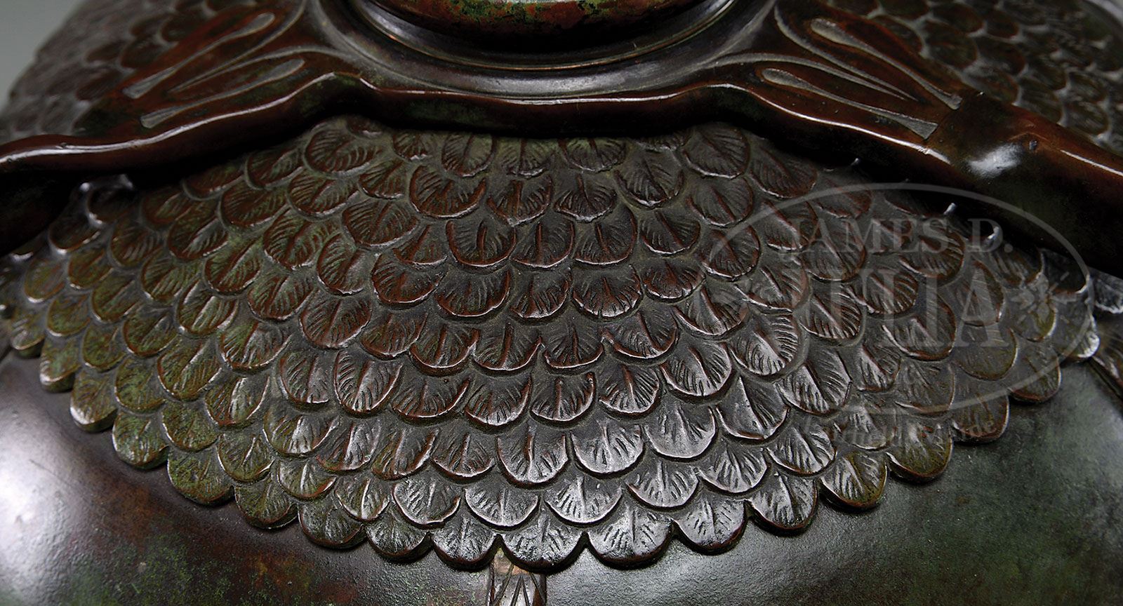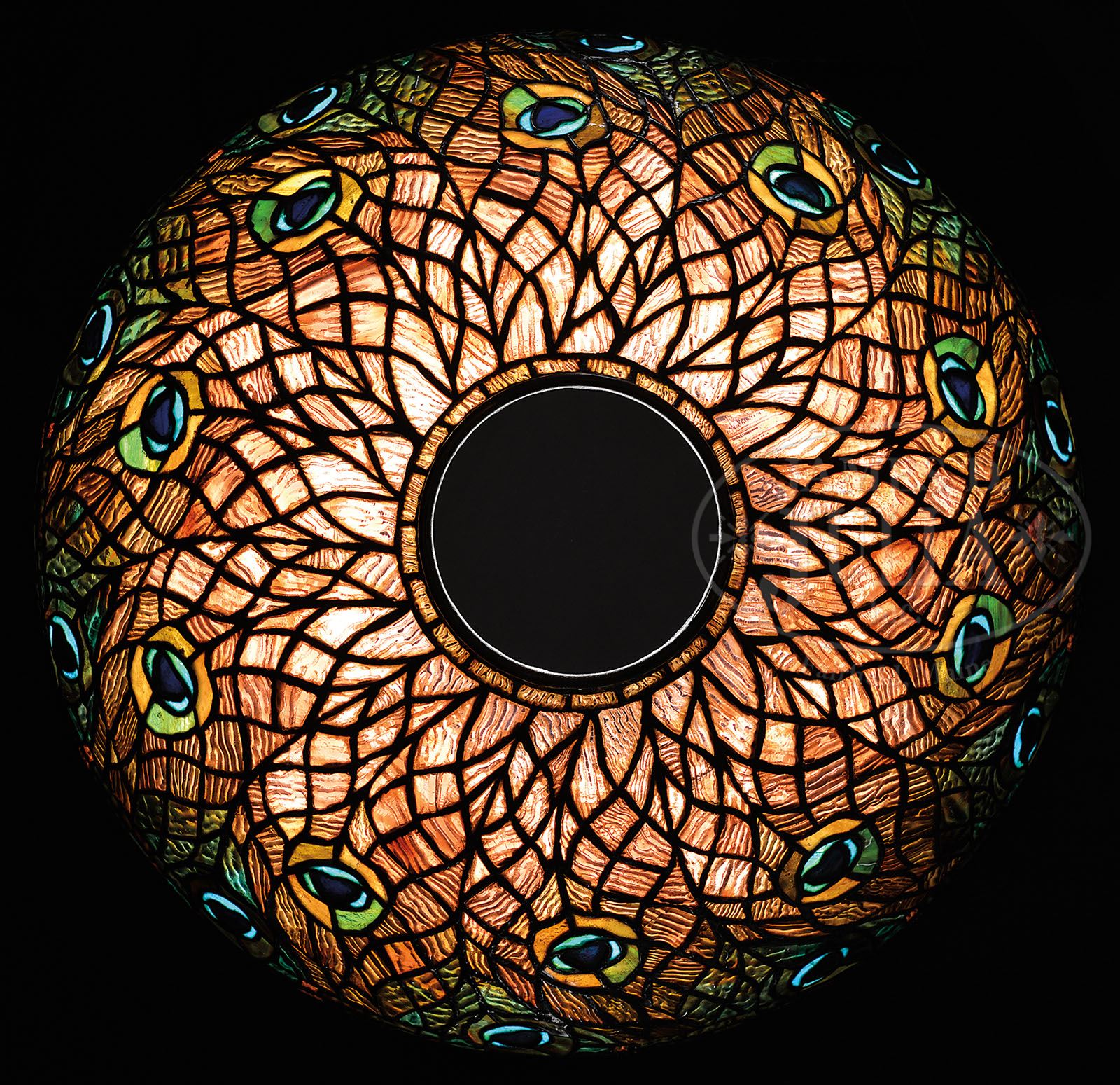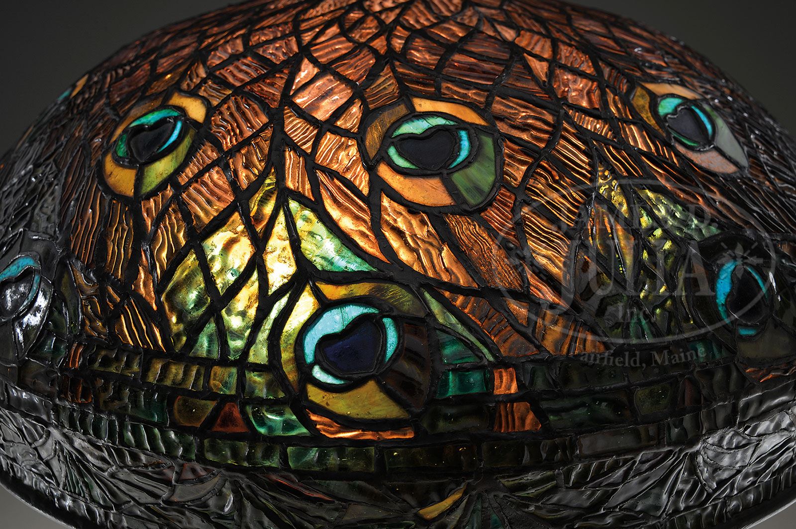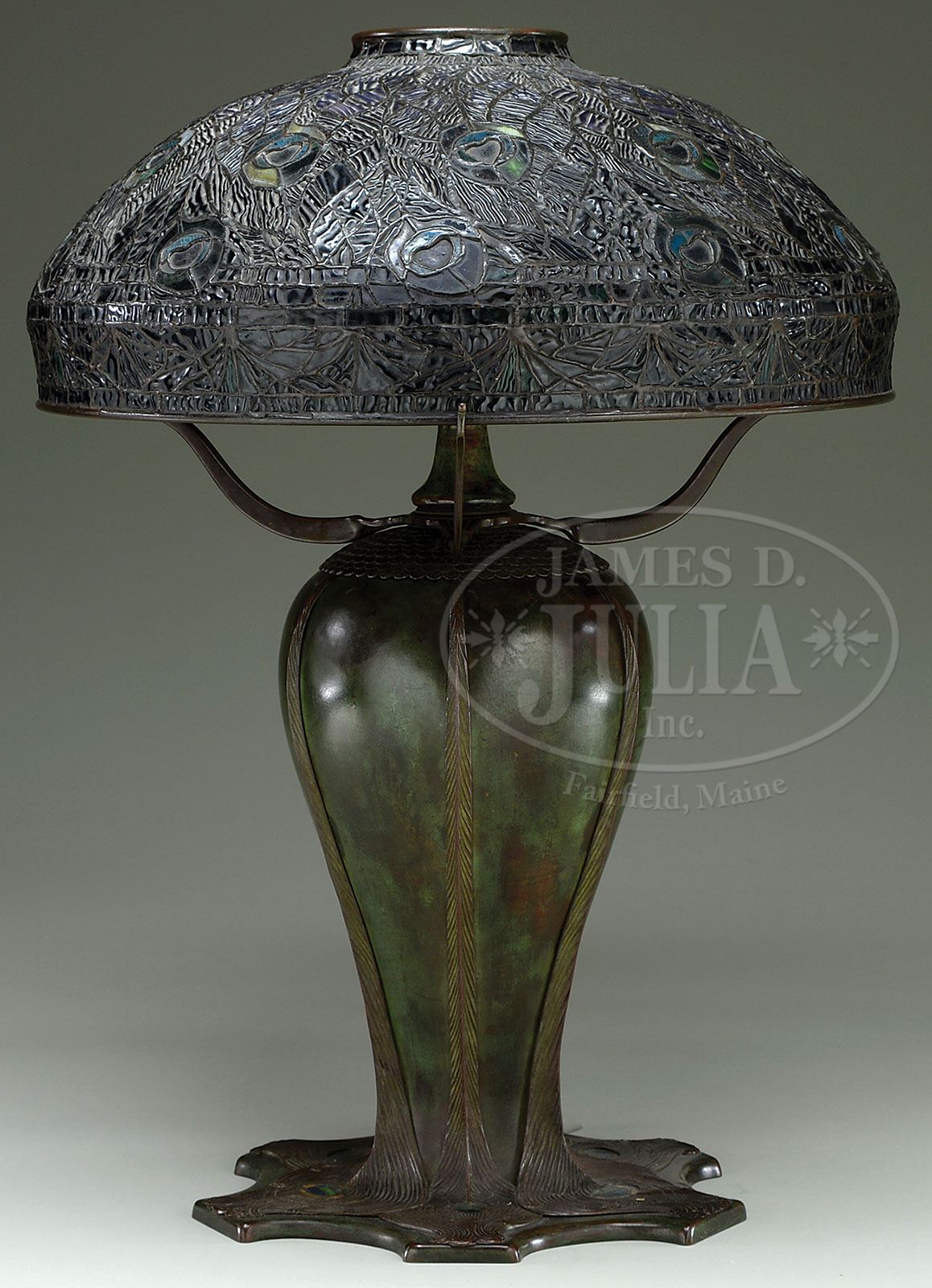 TIFFANY STUDIOS PEACOCK TABLE LAMP. Rare Tiffany Studios table lamp has leaded shade with peacock feather design and bright peacock feather eyes with blue and purple centers as well as turquoise shading to green glass around the centers and ember yellow and green surrounding. All set against an intricate background of mauve heavily textured drapery type glass. The shade rests on its original peacock feather base with urn shaped body and applied bronze peacock feathers with inlaid iridescent Favrile glass peacock eyes. The body of the base has a rich green patina while the peacock feather appliques have a reddish brown patina. The base is finished with a three arm spider and three socket cluster. Shade and base are unsigned. Underplate on base may be a replacement. SIZE: Shade is 18″ dia. Lamp is 26″ t. CONDITION: Shade appears to be slightly out of round, but there are very few if any tight hair lines and no signs of impact. Base is very good to excellent. When the consignor purchased this lamp, it had a dent in the side of the bulbous section of the base and he had it professionally repaired. 5-67588 (80,000-100,000)