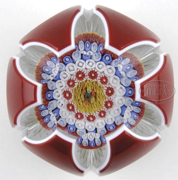 BACCARAT MUSHROOM PAPERWEIGHT. Close concentric millefiori mushroom in colors of red, yellow, white and blue encased in a red over white double overlay. Six side facets and six fancy cut side flutes. Star cut base. It has a “1969” date cane contained within the mushroom and signed on the underside with acid etched Baccarat insignia. SIZE: 3″ dia x 2-1/4″ t. PROVENANCE: Barry Schultheiss Collection. CONDITION: Very good to excellent. 5-63357 (350-650)