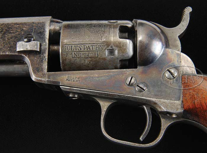SCARCE COLT MODEL 1849 POCKET PERCUSSION REVOLVER. SN 152403. Cal. 31. Blue and color case hardened with 4″ oct bbl, brass pin front sight and 2-line New York address with brackets. Left side frame has tiny “COLTS PATENT” and scarce small guard silver plated steel trigger guard and backstrap that contains a 1-pc walnut grip with last 4 digits of SN in backstrap channel. It is equipped with 5 shot cylinder with stagecoach holdup scene roll mark. According to COLT’S POCKET ’49, Jordan & Watt, only about 1,450 ’49 pocket revolvers were ever made with small iron trigger guards. Although this model was Colt’s most prolific percussion revolver with over 325,000 produced in the period 1853-73 they are rarely found with high orig finish. These fine and reliable little revolvers saw continuous service from the gold fields of California and the northwest territories, throughout the Civil War, Indian Wars and on the frontier during America’s great westward expansion, usually with minimal maintenance. PROVENANCE: Col. Kenneth P. Brown Collection. CONDITION: Very fine, all matching except wedge. Bbl retains 60-70% flaked orig blue with the flaked areas a medium patina. Rammer and handle retain most of orig case colors, bright on the pivot. Frame retains strong case colors on the sides, brilliant in the sheltered areas turning a little dark on the recoil shields and hammer. Cylinder is mostly a blue gray patina and retains about 95% stagecoach holdup scene. Trigger guard and backstrap retain most of their orig silver plating with some light bubbling and flaking. Grip has a chipped right toe, otherwise is sound, showing light wear and retaining most orig varnish. Missing one frame pin, hammer nose is chipped and timing needs adjustment, otherwise mechanics are fine. Strong dark bore. 4-39414 JR202 (2,500-3,500)