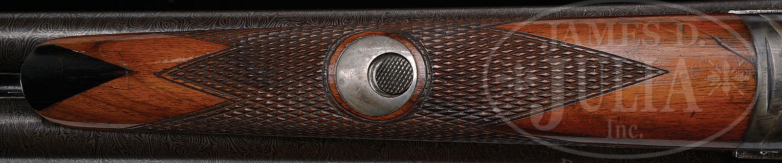 *VERY FINE L. C. SMITH SPECIAL ORDER “OE” GRADE. SN 4175. Cal. 12 ga. 2-3/4″ Chambers. 28″ Bbls. This gun, the lowest grade offered by L. C. Smith, is unusual in that it is fitted with “Good Damascus” bbls, generally not available in this grade, along with a nicely figured and streaked European walnut straight grip stock with scallop bordered checkering, a pattern usually found on grade 3 guns. Gun is also not fitted with a safety. It is however fitted with Hunter Arms early style ejector in splinter forend, with clam shell button secondary latch, only made available in this grade after 1899. Bore diameter: left-.726, right -.726. Bore restrictions: left -.038 (Full), right -.017 (Mod). Wall thickness: left -.028, right -.027. Drop at heel: 2-3/4″, drop at comb: 1-5/8″. Weight: 7 lbs. 3 oz. LOP: 14-1/8″. CONDITION: Exceptionally fine, retaining nearly all of its orig finish on all wood and metal parts, with slight evidence of silvering on sharp edges of metal, and numerous minor marks in wood, as might be expected from over 110 years of storage. Bores are excellent, bright and shiny throughout. Action is tight. Ejectors are in time. Guns of this grade invariably saw extended use. Finding an unusual example like this in this state of preservation is extraordinary. 4-47357 MGM45 (3,000-5,000)