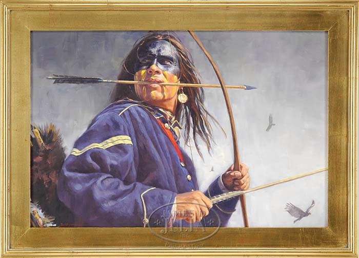 DAVID YORKE (American, 20th/21st Century) “THE HUNTED”. Oil on wood panel portrait of a Native American wearing a Union blue jacket with bow and arrow in hands. His face is painted and he holds an arrow in his mouth. A fur lined quiver rests off his back and three vultures fly in a gray sky. Signed lower left and dated “2004”. Housed in a modern gilt frame with gilt liner. The frame having a Trailside Galleries, Jackson, Wyoming label. This artist is best known for his Native American portraiture of which this is a fine example. SIZE: 20″ x 30″. PROVENANCE: From a private New Hampshire collector. CONDITION: Very good to excellent. 9-95352 (2,000-3,000)