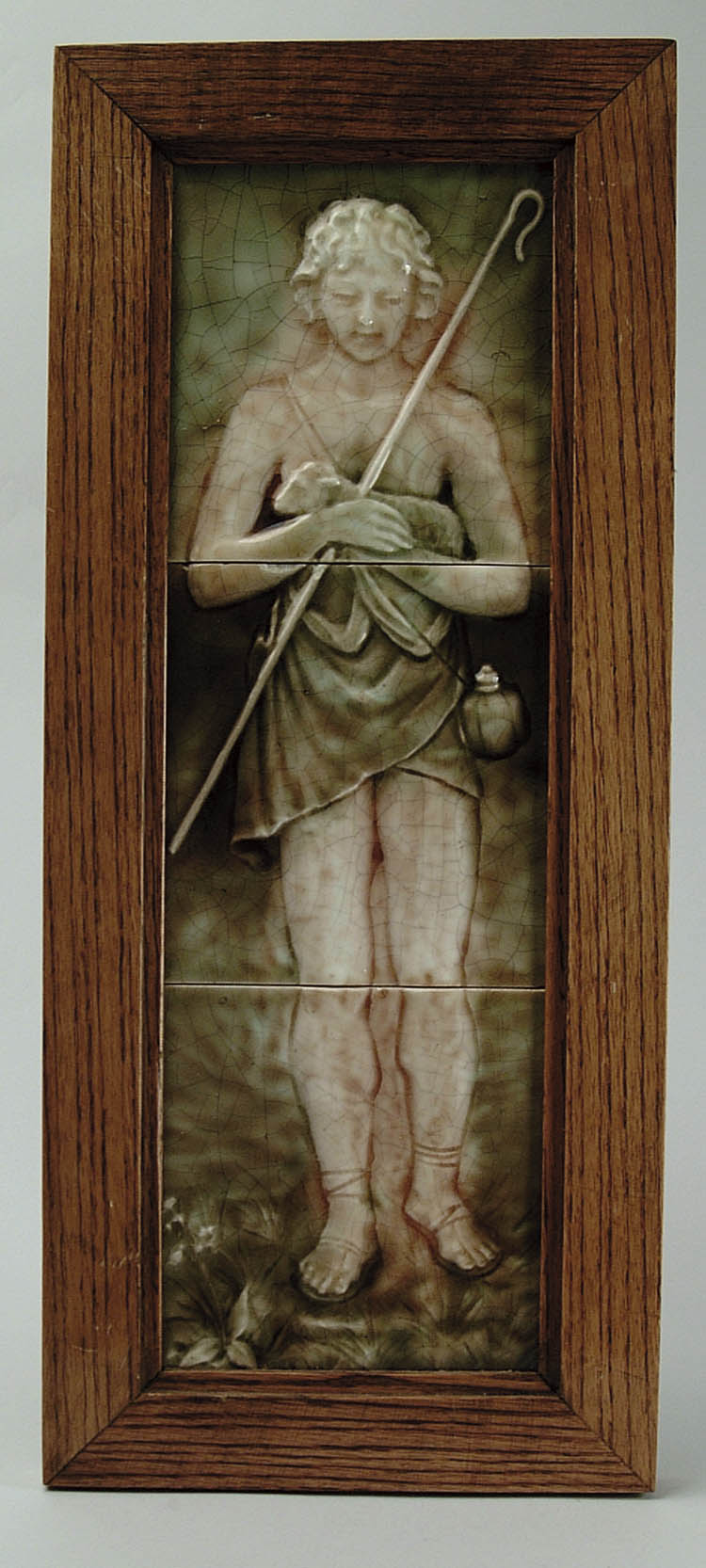 TRENT TILE GROUP. Framed set of three tiles by Trent Tile Co. depicts a shepherd boy with lamb. Framed in contemporary oak frame. SIZE: Tiles total 18″ by 6″. CONDITION: Nose of shepherd boy has chip. Center tile has 1/2″ long chip at edge, tiles show crazing. 5-67492 (800-1,200)