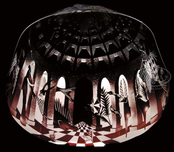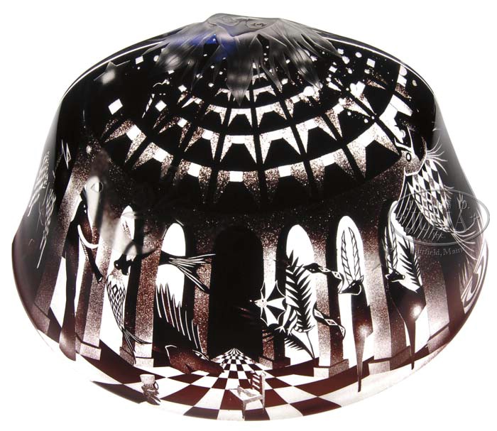 ETCHED & DECORATED GLASS HALF DOME. Wonderful glass half dome has acid cutback decoration on the interior of mythical and whimsical figures including an elephant, mermaid, dinosaur, lizard, snake and impala. The scenes are done in maroon glass cut to clear frosted. The pattern shows through the clear exterior of the half dome which is then engraved and acid cut with a whimsical man in the moon, stars and a stylized sun at the top. Artist signed on the exterior. Signature is illegible by may read “Mia 90”. SIZE: 20-1/4″ w x 11-3/4″ t. PROVENANCE: From the Collection of Dr. & Mrs. Ivan Cohen. CONDITION: Very good to excellent. 5-62927 (1,000-2,000)