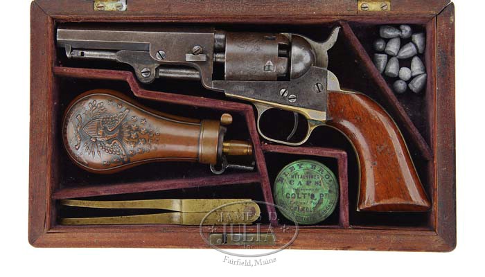 FINE CASED COLT MODEL 1849 PERCUSSION POCKET REVOLVER. SN 83802. Cal. 31. Early ’49 with 4″ oct bbl, brass pin front sight with 2-line New York City address with serifs. It has 5-shot cylinder with stagecoach hold-up scene & has “Colt’s Patent” on the left side of frame. It has silver plated trigger guard & back strap with 1-pc walnut grip. Accompanied by an orig purple velvet-lined Colt walnut casing compartmented in the bottom for the revolver, a single-sided “Colt’s Patent” flask, a 2-cavity brass “Colt’s Patent” mold, a small lacquered tin of Eley Brothers caps & some lead balls. CONDITION: Fine, all matching except the wedge which is unnumbered (grip was not checked). Revolver retains blue & case colors in the most sheltered areas being mostly a smooth plum brown patina. The cylinder has matching patina and retains about 85% stagecoach hold-up scene & all 5 safety pins are prominent. The trigger guard and back strap retain 70-80% thin silver plating. Grip is sound showing edge wear with nicks & scratches and retains 75-80% orig varnish. Mechanics are fine, strong, crisp, dark bore. Case is very fine with a small crack in the lid & another in the base and retains most of an old applied finish. Interior is lightly faded and soiled showing light wear. Flask is fine being a dark brass patina. Mold is equally fine. Altogether a fine set that probably saw service during the Civil War. 4-35423 JR122 (3,000-5,000)