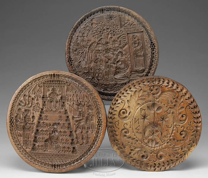 THREE ROUND CARVED MAHOGANY CAKE BOARDS. 19th century. All three intricately and ornately carved. Two are of renaissance or medieval subject matter. the third example carved with letters, stars, and crescent moon within a scrolling foliate border. The backs of each disc mounted with a brass fastening bracket. SIZE: d. 8-3/4″-8-1/4″ CONDITION: Overall very good, the latter example with minor losses around edge. 9-99706 (800-1,200)