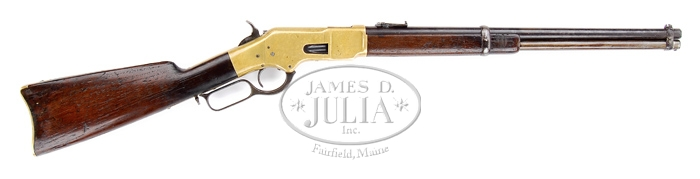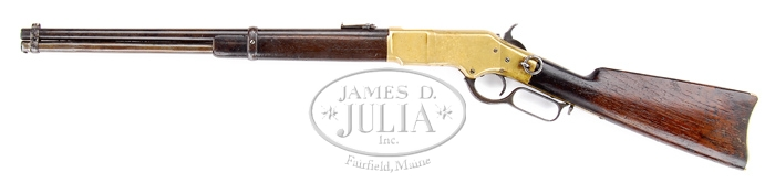 WINCHESTER 1866 SADDLE RING CARBINE LEVER ACTION RIFLE. SN 163476. Cal. 44RF Henry. Standard 20″ bbl with full mag with bbl band mounted front sight and reversed “1873” marked carbine ladder sight. Left side of receiver has usual staple and ring. Mounted with straight grain, uncheckered American walnut with straight grip and brass carbine buttplate. CONDITION: Good. Bbl is dark brown patina with numerous rough spots. Mag tube is a lighter brown-silver patina with rough spots that show aged cleaning. Front bbl band with sight shows a silver repair. Rear band is brown and crusty. Receiver has been cleaned a number of times and now retains a pleasant molting patina. Stock is sound with lots of nicks and dings and an old added oil finish. Bore is dark with lots of moderate pitting. Mechanics are good. 4-32905 BT51 (2,500-3,500)