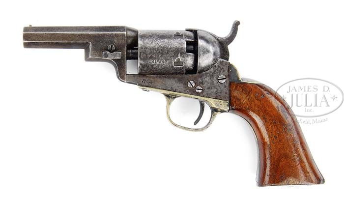 RARE COLT MODEL 1849 WELLS FARGO POCKET PERCUSSION REVOLVER. SN 143754. Cal. 31. Usual configuration with 3″ oct bbl, brass pin front sight and 2-line NY City address with brackets. Left side of frame is marked “COLTS PATENT”. It is fitted with silver-plated small trigger guard and backstrap containing a 1-pc walnut grip with the last four digits of the SN in the backstrap channel. Cyl is 5 shots with rolled stagecoach holdup scene. There is no precise figure on the number of these little revolvers that were produced in the period 1850-1860 but they are quite rare. PROVENANCE: Ted Knee Collection. CONDITION: Very good to fine, all matching including wedge and grip. Bbl, frame, cyl and hammer retain a smooth gray-brown patina, somewhat mottled on the frame and cyl. Cyl retains 80-90% stagecoach holdup scene with all five safety pins serviceable. Trigger guard and backstrap retain about 40-50% silver-plating with the balance a medium mustard patina. Grip is sound showing moderate wear with usual nicks and scratches and retains about 90% orig varnish. Mechanics are fine, strong bore with moderate pitting. 4-36576 JR309 (4,000-6,000)