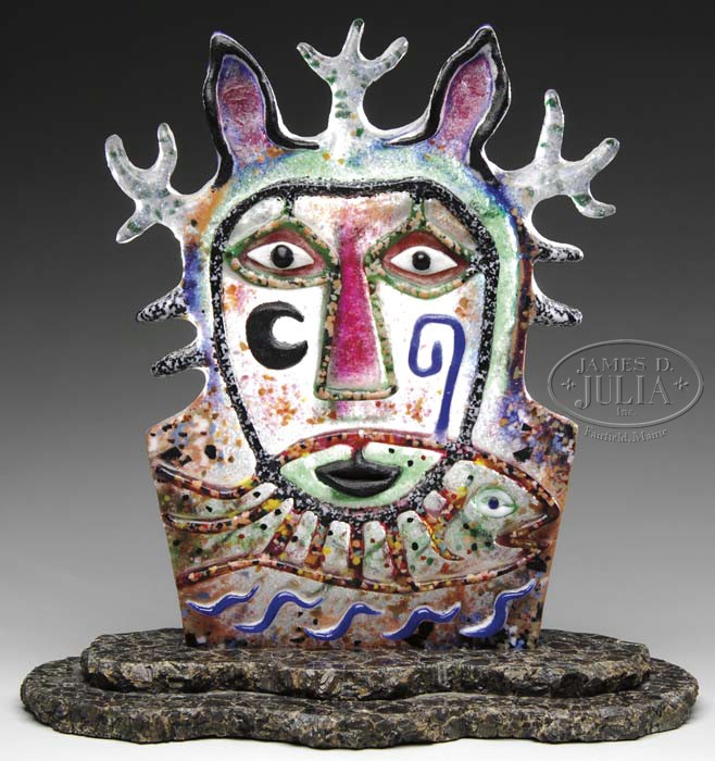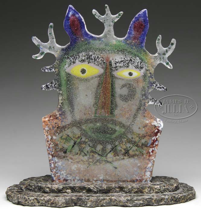 RUTH BROCKMAN ART GLASS SCULPTURE. Wonderful stylistic cast glass sculpture is entitled “Deerman With Fish”. Sculpture has a primitive feel with a stylized man’s face with deer antlers and a fish at his mouth. Sculpture rests in a stone base. Unsigned. SIZE: 18″ t. PROVENANCE: From the Collection of Dr. & Mrs. Ivan Cohen. CONDITION: Very good to excellent. 5-62838 (800-1,200)