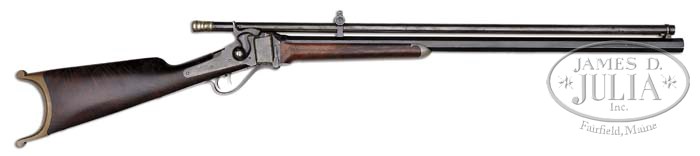 UNUSUAL SHARPS MODEL 1874 SPORTING RIFLE. SN C53678. Cal. 40-50 Sharps Bottleneck. Fine Sharps sporting rifle with 28″ medium weight oct bbl mounted with a 32-3/4″ Malcolm scope. Top flat of bbl is marked “SHARP’S RIFLE MANUFG. CO. / HARTFORD CONN” with the caliber marking over chamber area. There is also a small “20” on the top flat near the receiver. Rifle is mounted with highly figured, uncheckered American walnut with rnd, pewter tipped sporting rifle forend and straight stock with cheekpiece and heavy brass Swiss buttplate. SN was observed on top tang, bottom flat of bbl under the forearm, inside bbl channel of forearm, inside lockplate & trigger plate. Buttstock & buttplate are unnumbered but there is little doubt that they are orig to this rifle or, as a minimum, they have been with the rifle most of its life. Accompanied by a Sharps Rifle Co. records letter which identifies this rifle in 40 caliber with 28″ oct bbl, dbl triggers with globe & peep sights with varnished stocks and “rifle butt”. “Rifle butt” signifies a semi-crescent buttplate. It was invoiced at Hartford factory on Sept. 6, 1872 to George A. Fairfield of Hartford, CT who was one of the most heralded machine-tool designers of the 19th century along with Richard S. Lawrence, Elihu Root and Francis Pratt. The letter notes that Mr. Fairfield may have been a Sharps employee but was, for a time, the superintendent of the Weed Sewing Machine Co. which shared space with Sharps. The letter also notes that this rifle had been in the collection of noted Sharps historian & author, Frank Sellers. This exact rifle, identified by SN, in its current configuration is pictured on p. 239 of the book Sharps Firearms, Sellers. Mr. Sellers notes that the scope, with buttstock cheekpiece and heavy Schutzen style buttplate are “unusual for such an early gun”. PROVENANCE: George A. Fairfield; Frank Sellers Collection; Dr. Richard J. Labowskie Collection. CONDITION: Very fine, all matching except stock & buttplate as noted. Bbl retains about 95-96% strong orig blue with only sharp edge wear; scope retains about 65-70% thin orig blue; optics are clear with the spider web crosshairs a little slack; receiver retains strong case colors in sheltered areas with smoky colors on the two raised side panels; top tang has case colors under the sight with the balance turned silver; lever retains dark case colors; lockplate retains about 65-70% orig case colors, dark around the hammer, faded on the tail; hammer retains strong bright case colors; trigger plate retains about 50% dark case colors with the rear half faded colors; stock has a couple of tiny hairlines back of lockplate, otherwise wood is sound and retains most of its orig finish showing wear over the center of the forearm. Mechanics are crisp, very bright shiny bore. 4-44920 JR327 (20,000-30,000)
