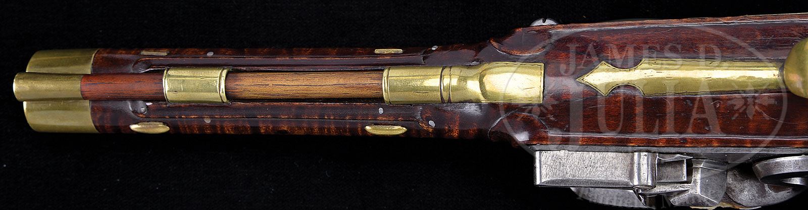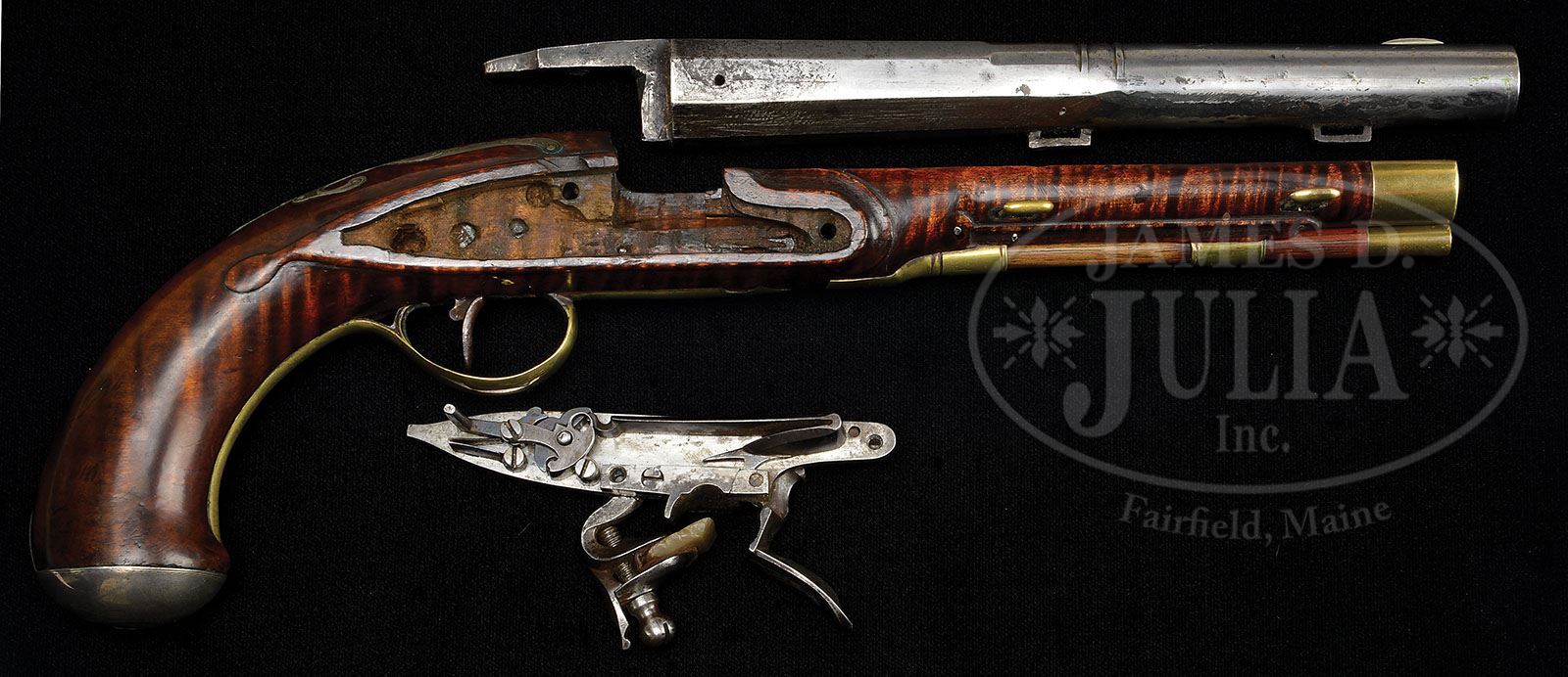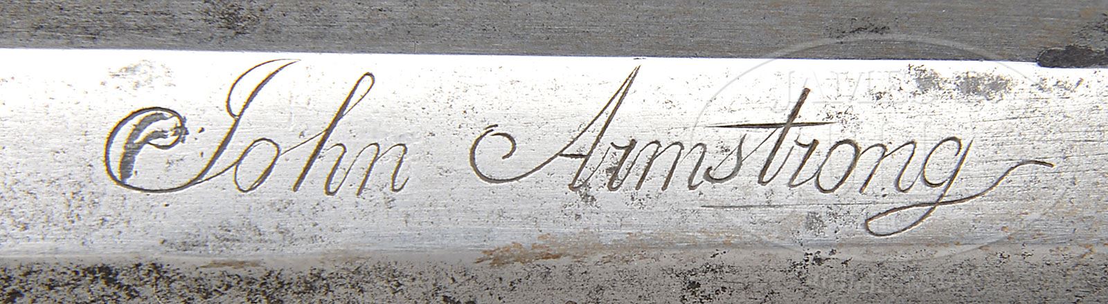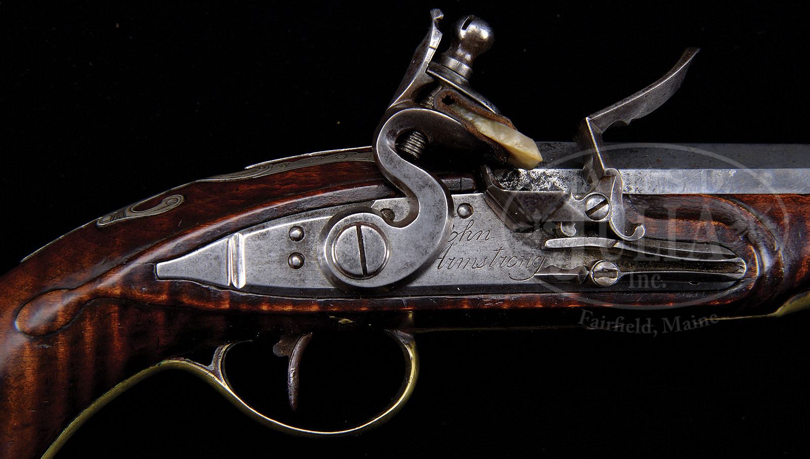 Please note: this fabulously rare gun has been correctly described as having been restored. While the cataloger was familiar with the gun and knew it had been restored, it was not known what was done to the gun and when the gun is examined in its complete state, it is impossible to see. However, when the gun was disassembled and photographed and put online so all could see both the exterior and the interior; one of the photographic images was taken with appropriate lighting and when the photograph was blown up, one of our viewers actually found the restoration or at least part of the restoration which shows that the wood forward of the frizzen pan having been replaced. There is a seam detectable in one of these photographs. Even when the gun is re-assembled and you know exactly where the seam is on the exterior, you cannot find it or at least we could not find it. The purpose of this note is not to announce the gun is restored as we already announced that in the description. The purpose is to give you a definition of what the restoration is or at least part of the restoration that we have been able to determine since the description. OUTSTANDING AND RARE JOHN ARMSTRONG KENTUCKY PISTOL BELIEVED TO BE THE ONLY SIGNED ARMSTRONG PISTOL IN EXISTENCE. SN NSN. Armstrong rifles have commanded the highest price of the “golden age” Kentucky’s and this pistol, the only one currently known by this fine maker, is outstanding. This pistol is an example of Armstrong at his best. Pierced brass sideplate and large engraved silver buttplate greatly enhance the design and beauty of this piece. Curly maple stock is very handsome with relief border carving on both sides. All the mountings are engraved by Armstrong in the finest manner. Large scroll engraved inlay of silver extends down the stock from both sides of the bbl tang. “This trademark” of Armstrong is also found on most of his rifles. Overall length is 13-1/8″ and bbl is 7-7/8″ oct to rnd .50 Cal smooth and is signed in script “John Armstrong”. Bedford Style orig flintlock is also signed in script “John Armstrong”. Stock is of the finest curly maple with relief carved tear drops to the rear of the lock and sideplate panels. Silver inlay running rearward from the bbl tang is masterfully engraved. As Joe Kindig states in his book, Thoughts on the Kentucky Rifle in it’s Golden Age “John Armstrong’s workmanship is magnificent, and his designs are just about perfection. I cannot overemphasize the beauty of his rifles.” This very pistol is pictured on pgs. 22-23 in The Samuel E. Dyke Collection of Kentucky Pistols printed in 1964. It is interesting to note Sam Dyke has stated he purchased this pistol in 1957 from Joe Kindig Jr. in York, PA for $400. In a letter to Tom Seymour dated July of 1977 Sam Dyke states the $400 he paid Joe Kindig was a top price at that time and that “this pistol has been talked more about and photoed more than any pistol I ever owned”. This very pistol is pictured on p. 96 plate number 90 of The Pennsylvania Kentucky Rifle by Henry Kauffman. PROVENANCE: Ex Joe Kindig Jr., Samuel E. Dyke and Tom Seymour Collections. Frank Sujansky Collection. CONDITION: This pistol appears to be in outstanding condition throughout however in Sam Dyke’s letter dated July 28, 1977 he indicates prior to his purchase of the pistol from Mr. Kindig there had been some expert restoration and that the restoration had been done by a top flight restorer. Whatever that restoration may have been is unknown at this time and cannot be seen upon visual inspection- it was absolutely expertly done. Upon disassembly there appears to have been some welding on the bottom of bbl between the two bbl wedges.? 4-49460 RG28 (100,000-175,000)