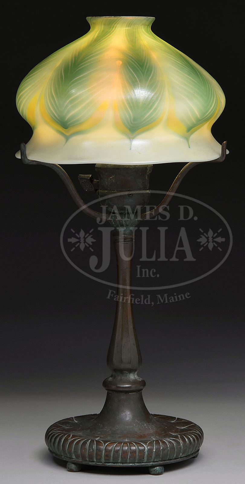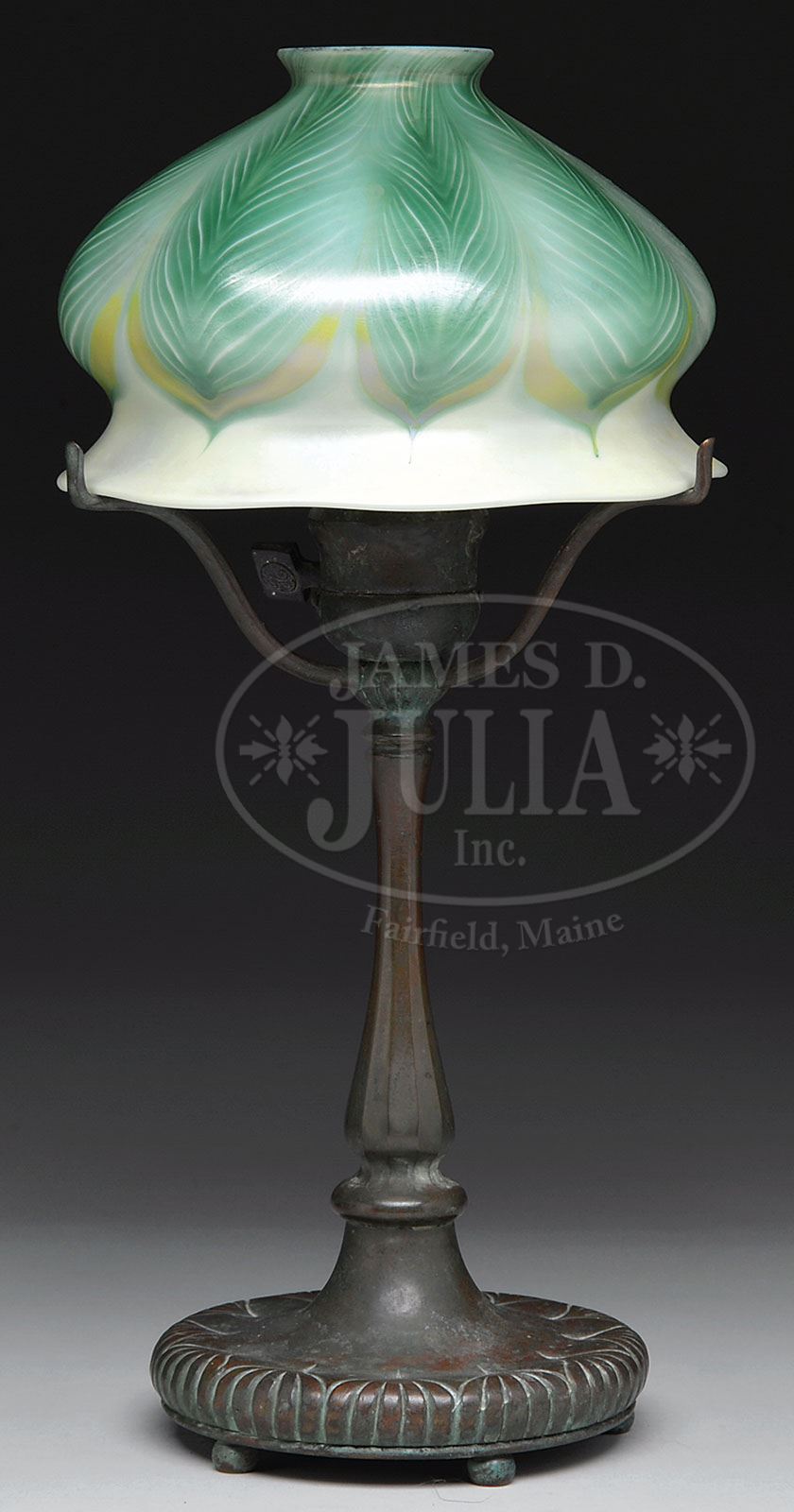 TIFFANY PULLED FEATHER LAMP. Nice Tiffany desk lamp, has a favrile glass shade with green pulled feather design descending from the top. Each pulled feather is outlined in gold iridescence with nice blue highlights. The design in set against a cream colored, slightly iridescent background. The shade rests on a Tiffany bronze base with impressed onion design surrounding the edge. The base rests on five ball feet and has a single socket and three-arm spider supporting the shade. Shade is signed “L.C.T.” and base is signed “Tiffany Studios New York 322”. SIZE: 14-1/2″ t. CONDITION: Very good to excellent with some discoloration and corrosion to bronze base. Base has old plastic cord which is cracking. 5-67523 (4,500-6,500)